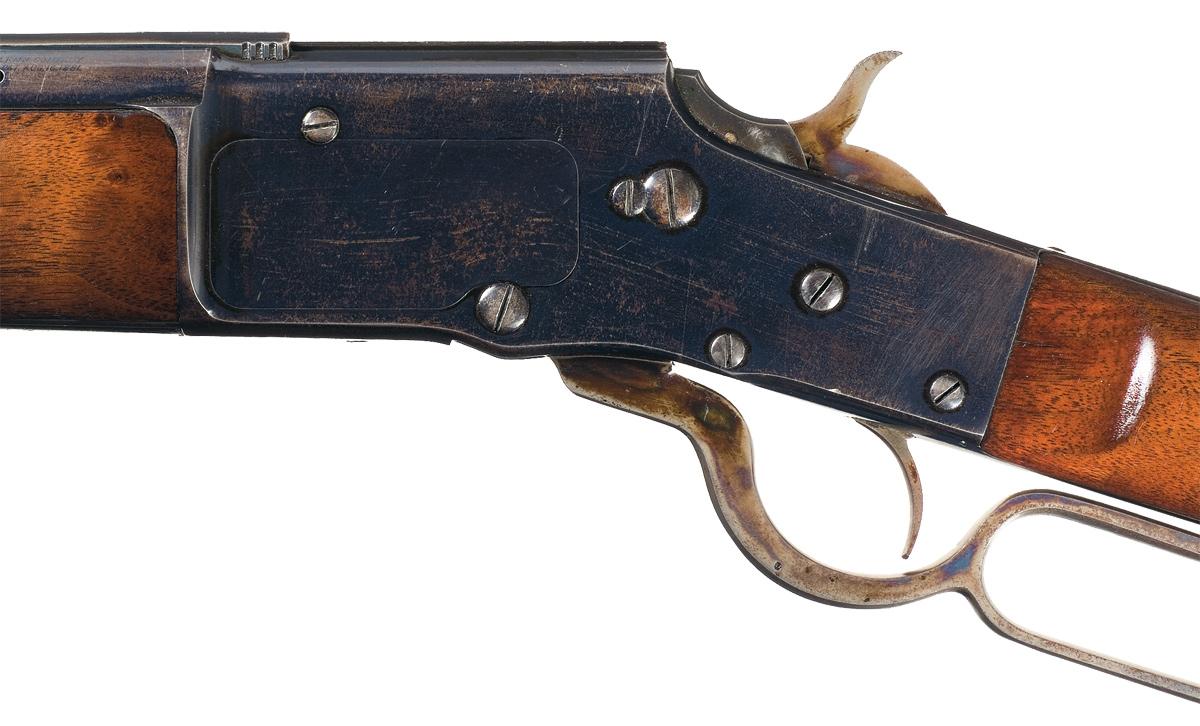 Bullard rifles are considered very rare on the collector market today as they were produced only from 1886 to 1890. They competed for sales directly against the Winchester, Marlin and Whitney lever actions rifles also produced during this time. This fierce competition really stymied their sales creating a very limited production of Bullard rifles, (approximately 10,000 to 12,000). This rifle employs a very long receiver/action that houses a brass cartridge lifting mechanism, (very similar to the Winchester 1876 rifles) to accommodate the larger and longer cartridges. It has a 6 1/4 inch straight cylindrical bolt (similar to the 1873 and 1876 Winchester rifles). This bolt has a unique two tooth gear mechanism at the rear that engages a similar two tooth geared mechanism on the front of the breechblock. This geared mechanism is operated by the loading lever and basically acts as the locking lug for the rifle bolt which gave it far more strength to withstand higher pressure of the larger cartridges. The left side of the receiver has a small side plate that allows access to the mechanism inside and the loading gate for the tubular magazine is located on the under side of the receiver. It features a full magazine and is equipped with a Lyman ivory bead front sight, rifle style ladder rear sight and the upper tang has been drilled and tapped for a tang sight. The left side of the receiver has usual "BULLARD REPEATING ARMS COMPANY / SPRINGFIELD MASS. U.S.A. PAT. AUG. 16. 1881." markings and the right side is marked "Model 1886". The top front of the receiver is marked "Cal / 45.". The serial number is on the rear of the frame just behind the hammer slot and also found inside top and bottom tangs at the tips and on the face of the buttstock inside the action. Blue finish on action, forearm tip, barrel and magazine tube, with casehardened hammer, lever and trigger. Mounted with straight grain uncheckered American walnut with straight stock, iron end cap and checkered hard rubber Bullard buttplate. All matching numbers.