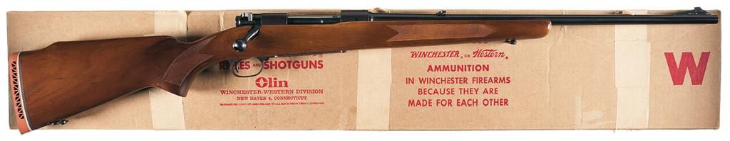 Manufactured in 1962. The rifle has a ramp front sight with provisions for a hood, an adjustable folding leaf rear sight and a receiver tapped for sight/scope mounting. There are standard Winchester markings including the factory oval proof on the left side of the barrel and receiver at the breech. Polished bolt numbered to the gun, hallow bolt knob and straight receiver tang. The checkered high comb pistol grip stock features sling swivels and a vented Winchester recoil pad. The factory box has the correct end label numbered to the gun.
