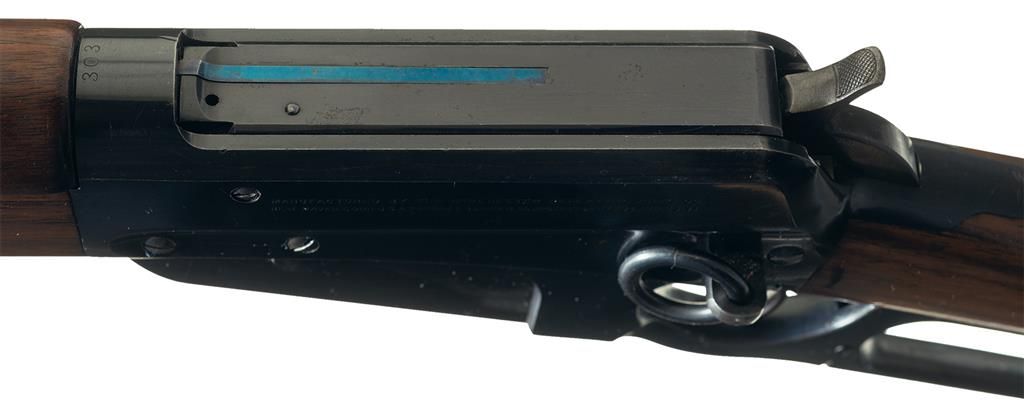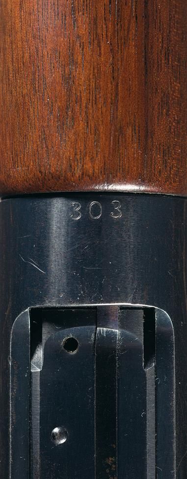 Extremely fine. The carbine retains more than 85% plus of the blue finish. Wear consists of some minor finish loss on the muzzle and barrel band and edge wear on receiver high points. The sides of the magazine have the characteristic functioning wear. The finish on the buttplate is thin and fading to a silver brown patina. The action is excellent. All of the markings are sharp. The stock and forearm are very fine with a few scattered and very minor handling and storage marks. This is a fine example of a hard to find .303 British Winchester Model 1895 Carbine.
