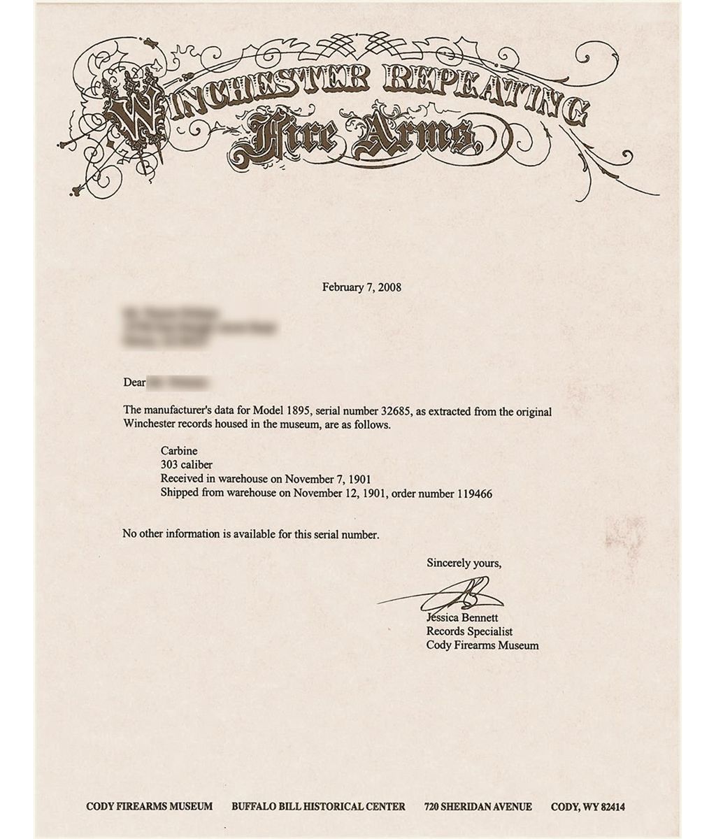 This is an example of a Saddle Ring Winchester Model 1895 carbine with letter from the Cody Firearms Museum. The letter states that Carbine serial number 32685 was chambered in .303 caliber and shipped from the Winchester warehouse on November 12, 1901. The carbine has a 22 inch round barrel, second style receiver, military style forearm with grasping groove, staple mounted saddle ring on the left side of the stock and carboline style butt plate with sliding trap door. The barrel has a Winchester Express front sight with ivory bead and a military style, folding leaf rear sight. The butt trap contains a pull through "U.S. Government Cleaner". The carbine has the Winchester commercial blue finish with case hardened hammer. The stock and forearm are straight grain American walnut. The top of the receiver is roll stamped with the caliber designation "303". The model designation: "WINCHESTER/MODEL 1895-" is roll stamped in two lines on the upper receiver tang. The upper left side of the receiver is roll stamped with the Winchester elongated two line legend with five patent dates. The serial number, "32685" is stamped across the bottom of the receiver behind the trigger.