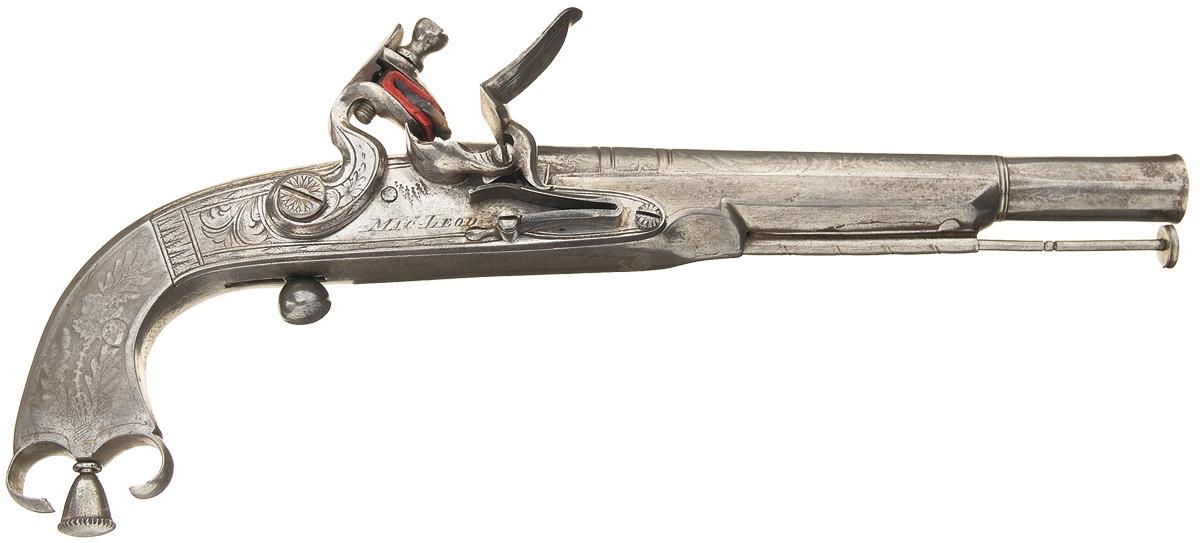 The barrel is stamped with a pair of crown over scepter proofs, with a flared octagonal muzzle and a notch rear sight. The ramshorn style butt has two curved 3/4 semi circles with a decorated dome. Lock plate is marked "Mac-Leod" below the flashpan, with scroll engraving on the lock, border designs on the frizzen and floral engraving on the hammer and screws. Both the barrel and stock are etched with designs of Scottish thistles, along with an array of arms on the underside of the stock and the family crest of J. Aird etched on the wrist behind the rear sight, featuring a standing lion on a field of stars, set on a shield. Stock is fitted with a metal ramrod, a belt hook along the left side, ball trigger and a flared rams horn butt with a screw-in touchhole cleanout pin and "J. Aird", who was the original owner, signed on the left side.