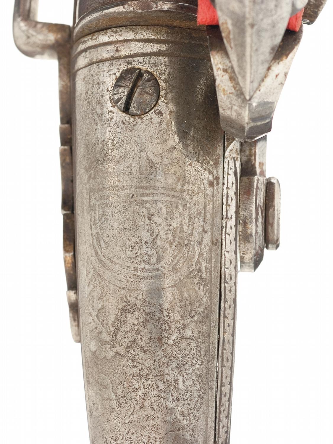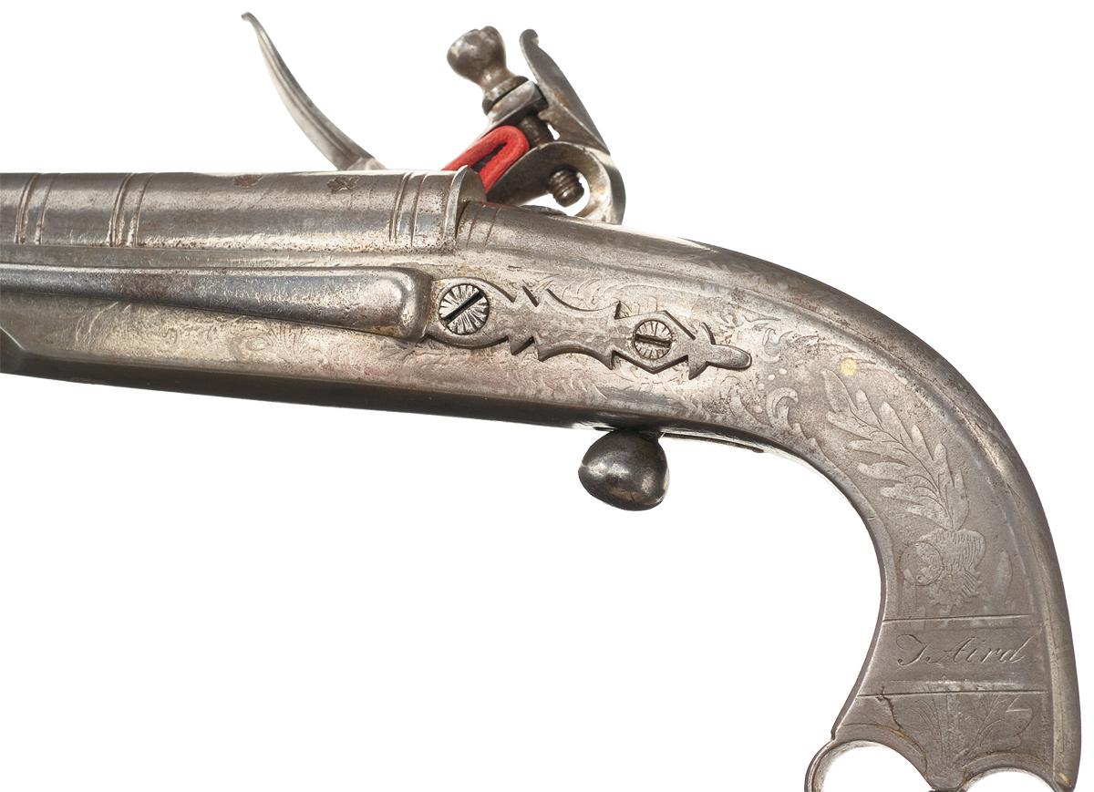 Condition: Good, with a smooth bright satin gray patina overall, showing a few small areas of brown, handling marks and scattered pitting overall. A few small cracks are visible on the stock. Etching is very good, showing a few faint areas. Mechanically excellent. A very nice highly decorated Scottish all steel pistol.
