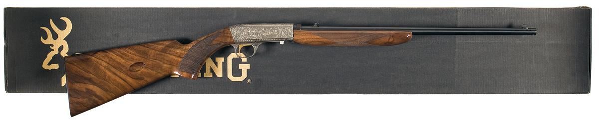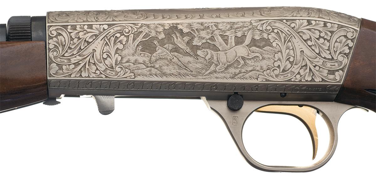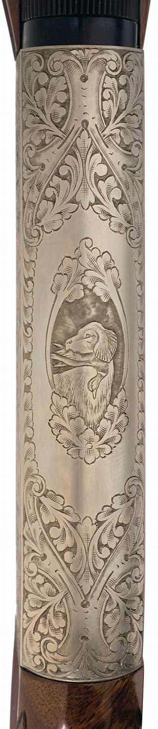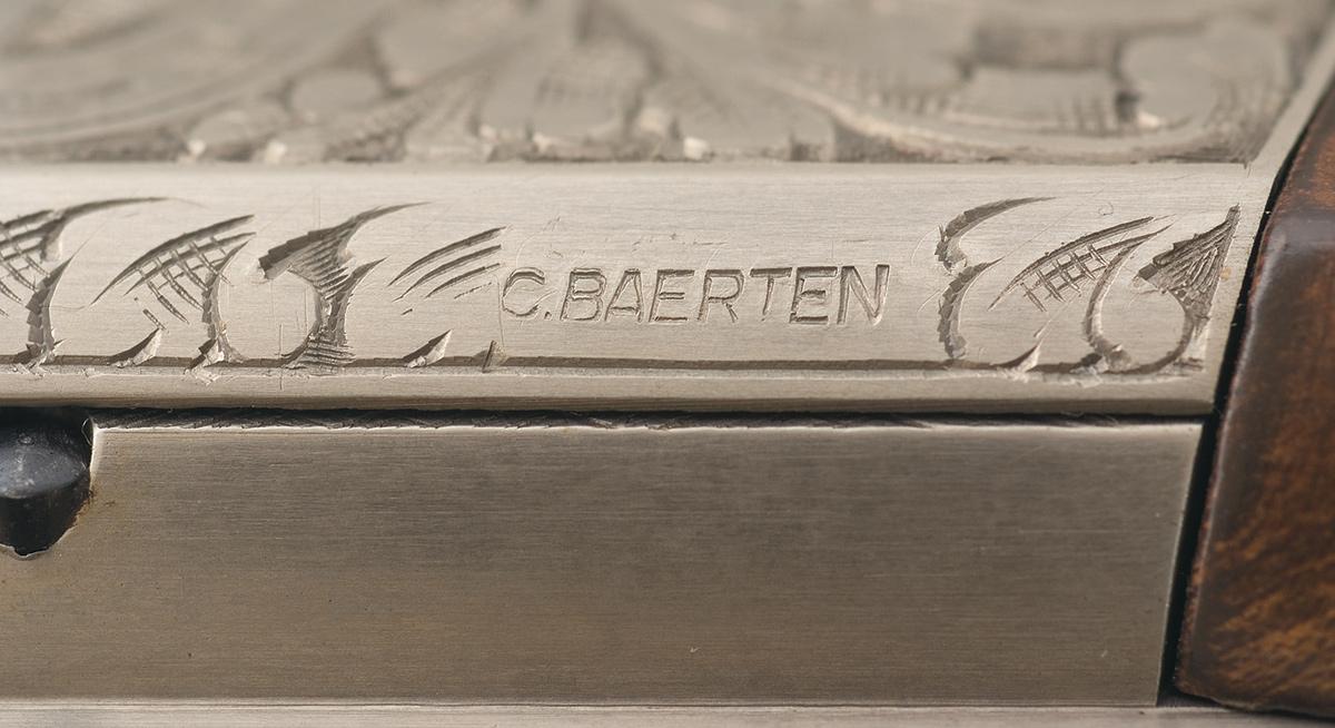 Made in Belgium. Blade front and adjustable folding leaf rear sight. The top, breech end of the barrel is factory drilled and tapped for scope mounting. The receiver is engraved with floral scroll designs as well as game scenes of a hunting dog chasing two pheasants in a wooded scene on the left and a hunting dog chasing three ducks in a wooded marsh scene on the right . The top of the receiver has a dog with a duck in it's mouth. The lower left rear of the receiver is signed "C BAERTEN". Gold washed trigger and mounted with a fancy walnut, high gloss checkered semi beaver tail forearm and pistol grip stock. Complete with the original box numbered to the gun and trigger lock.