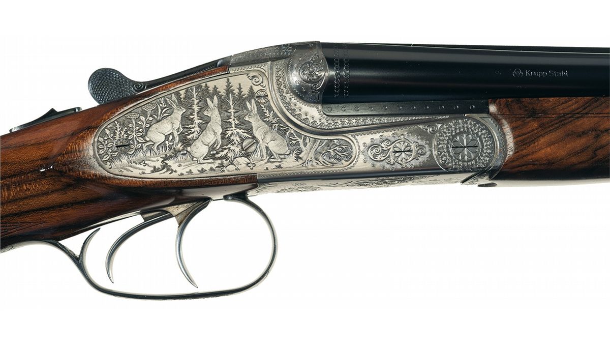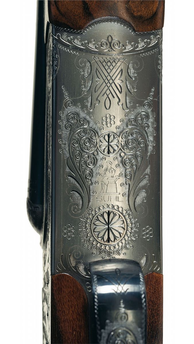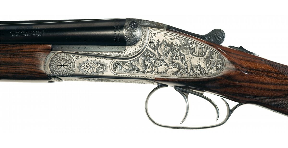 Solid concave matte rib barrel with single brass bead sight marked "147 SL 20 GA" in a panel at the breech end. Choked improved cylinder/modified, 3 inch chambers with ejectors. Light scroll and geometric engraving on the action, trigger guard and break lever, with relief engraved rabbits in a wooded scene on the right side plate and a hunting dog and quail on the left side plate. The left side plate is singed "BH" (Burkhadt Hafner). The underside of the action is marked with the "SUHL" logo. Holland & Holland style side locks with cocking indicators, coin finished action and side locks, with blue on the remaining parts. Standard barrel markings, double triggers, tang mounted automatic safety and mounted with an extra fancy multi-point checkered English walnut forearm and straight grip stock with black plastic Merkel buttplate. Length of pull is 14 5/16 inches. Complete with the original box numbered to the gun.