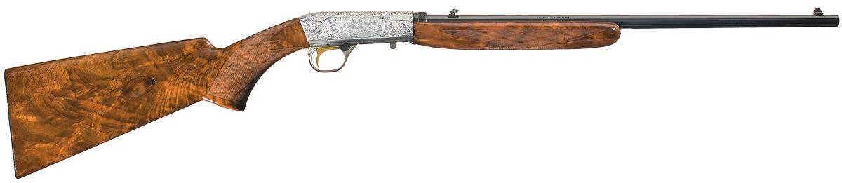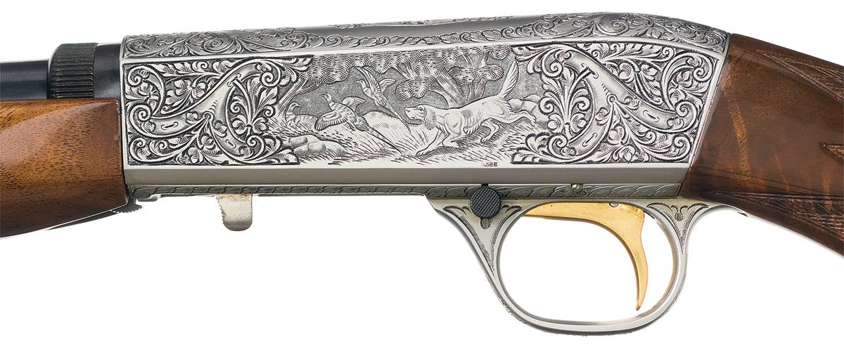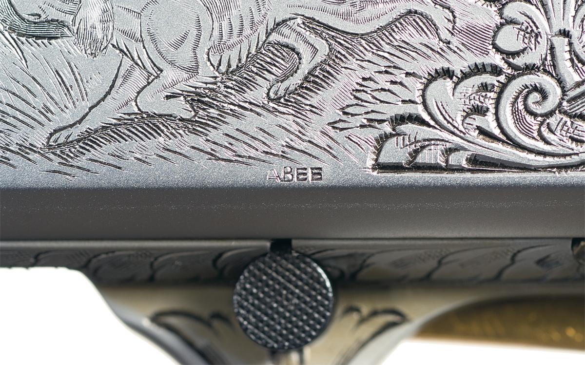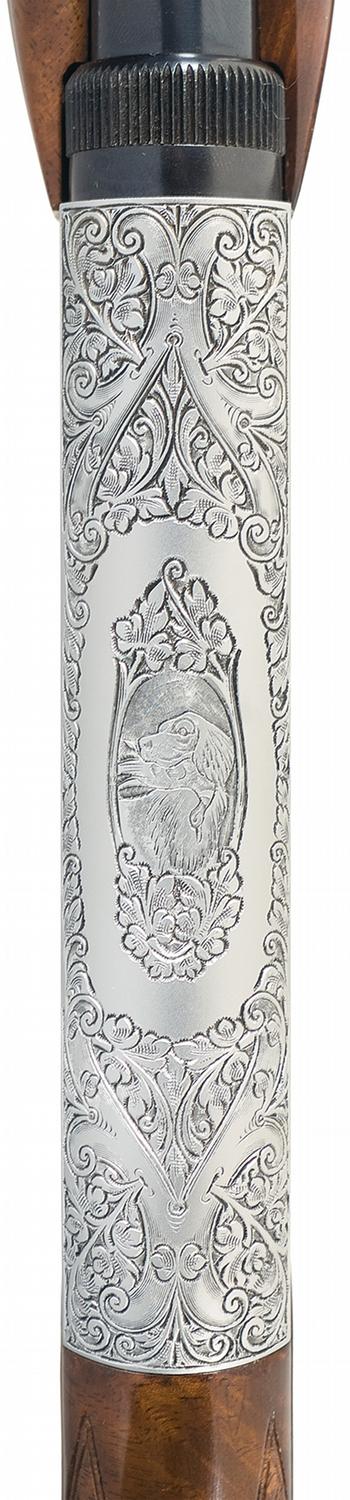 Made in Belgium. Blade front and adjustable folding leaf rear sight. The top breech end of the barrel is factory drilled and tapped for scope mountings. The receiver is engraved with floral scroll designs as well as game scenes of a hunting dog chasing two pheasants in a wooded scene on the left, and a hunting dog chasing three ducks in a wooded marsh scene on the right. The top of the receiver has a dog grasping a duck in its mouth. The lower left rear of the receiver is signed by Master Engraver Angelo Bee: "A BEE". Gold washed trigger and mounted with a fancy walnut high gloss skip lined checkered semi-beavertail forearm and pistol grip stock.