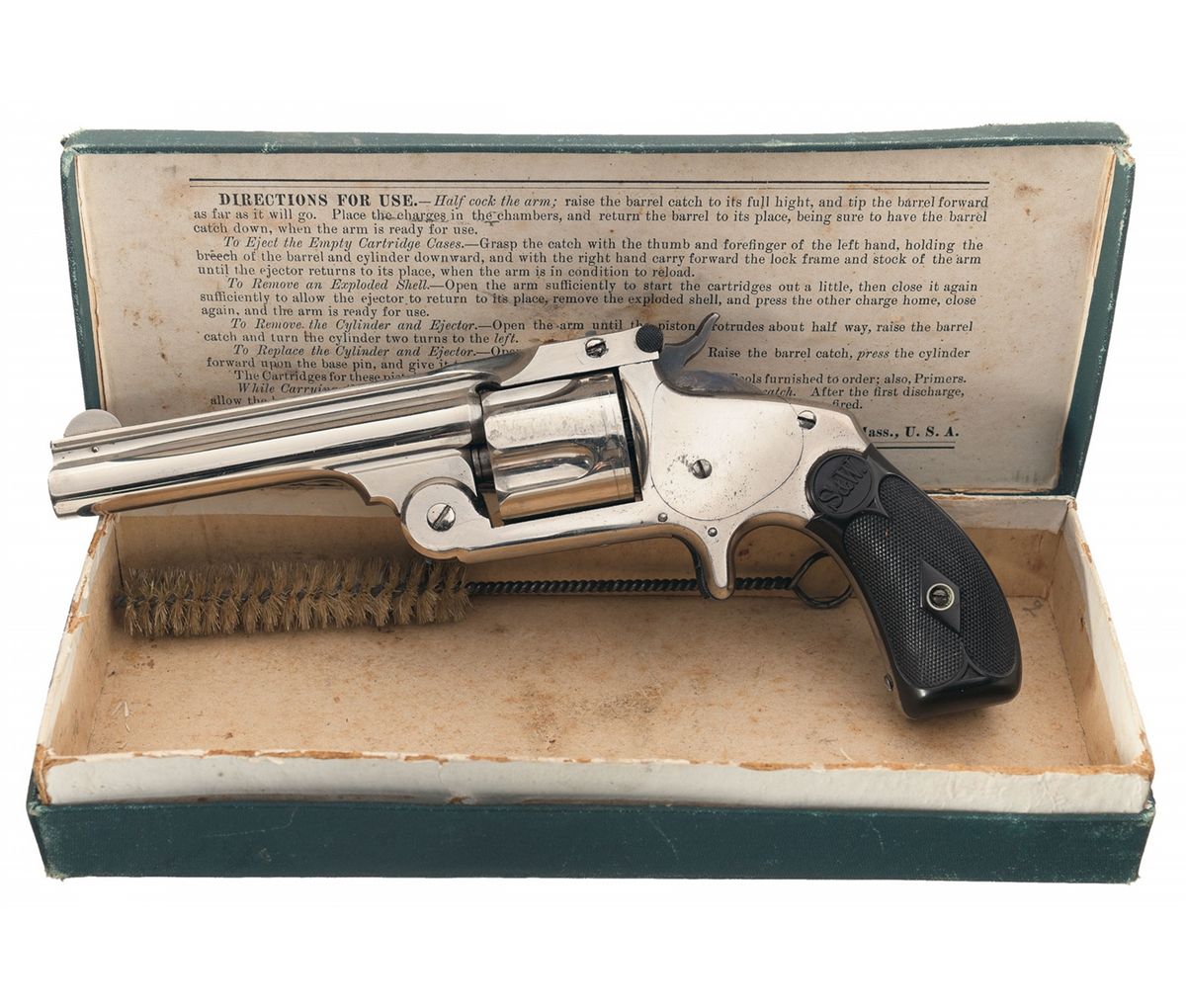 Manufactured from 1877 to 1891. The top of the barrel rib is marked with the two line address/patent dates with the matching serial number on the butt, barrel, latch and cylinder. Pinned front sight and notch rear sight on the latch. Fitted with checkered S&W monogram grips with the right panel numbered to the gun. Included with the revolver is the correct factory box.