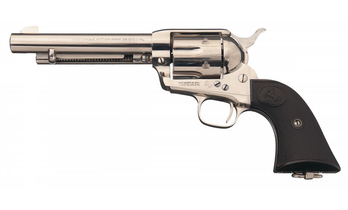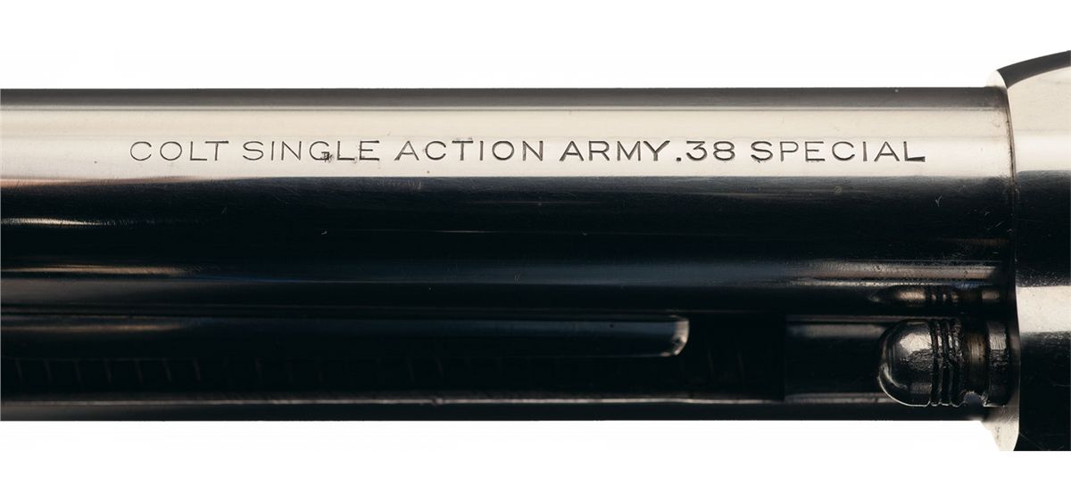 Colt Single Action Army revolver manufactured in 1929. The revolver has a full nickel-plated finish with black checkered hard rubber grips with the Rampant Colt motif in an oval at the top. The butt is fitted with a special order factory lanyard loop. The revolver is chambered for the .38 Special cartridge and the cylinder has beveled chamber mouths which indicate that it was manufactured for the .38 S&W Special cartridge rather than the .38 Colt Special cartridge. Colt Single Action revolvers chambered for the .38 Colt Cartridge had chamber mouths with 90 degree shoulders. The "BOOK OF COLT FIREARMS" by R.L. Wilson states that 25 Colt Single Action Army revolvers were chambered for the .38 S&W Special cartridge and 82 were chambered for the .38 Colt Special cartridge. The left side of the barrel is roll-stamped with fourth style barrel marking "COLT SINGLE ACTION ARMY .38 SPECIAL" introduced in 1929. The top of the barrel is roll-stamped "COLT'S PT. F.A. MFG. Co. HARTFORD CT. U.S.A." in one line. The left side of the frame is roll-stamped with the three-date/two-line patent marking followed by the Rampant Colt trademark. The left front trigger guard bow is stamped with a "1" assembler's mark over the Colt triangle/VP proof mark. A "5" inspection mark is stamped in the hammer well. The assembly number "779" is stamped on the inside of the loading gate. The full serial number "352757" is stamped on the bottom of the frame and the right side of the trigger guard and backstrap underneath the grip. The partial serial number "57" is stamped on the rear face of the cylinder. "325757" is etched on the inside of both grips. All of the visible serial numbers match.