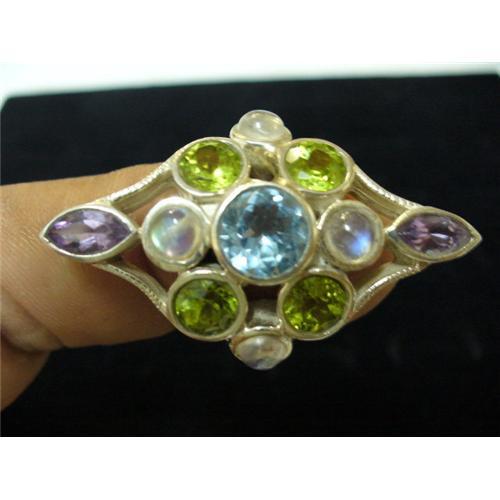 This Ring is for that special lady that loves big rings. Ring size is 7 3/4, it holds 1 9mm sky blue topaz, 4 6mm round beautiful peridots, 28x4 marquise cut amethyst and 4 5mm round beautiful moonstoons. Total caret weight is just over 9 cts. This beauty is 925 heavy sterling and all stones are bezil set so as not easy to lose a stone. Should appraise for 325.00 to 400.00.