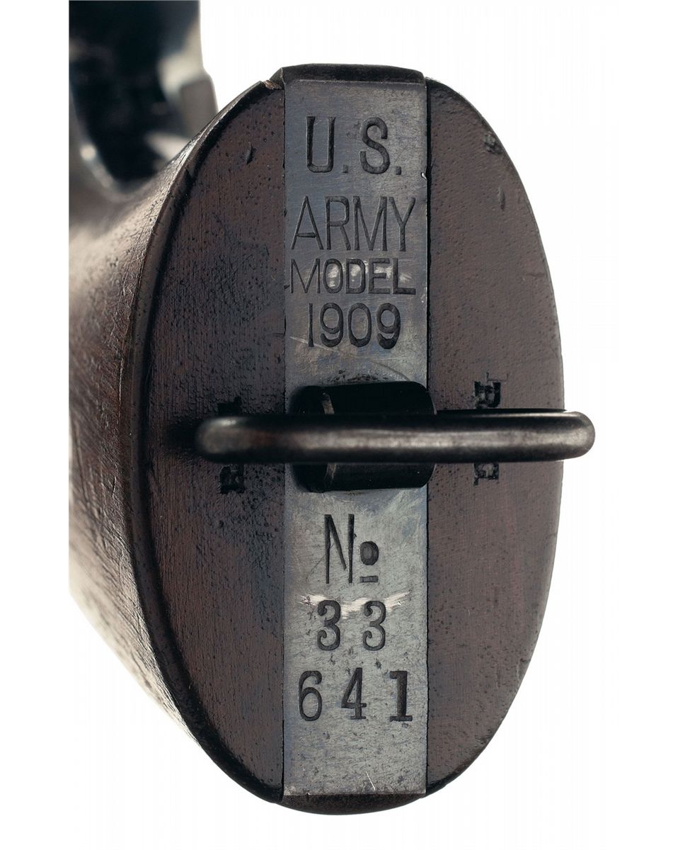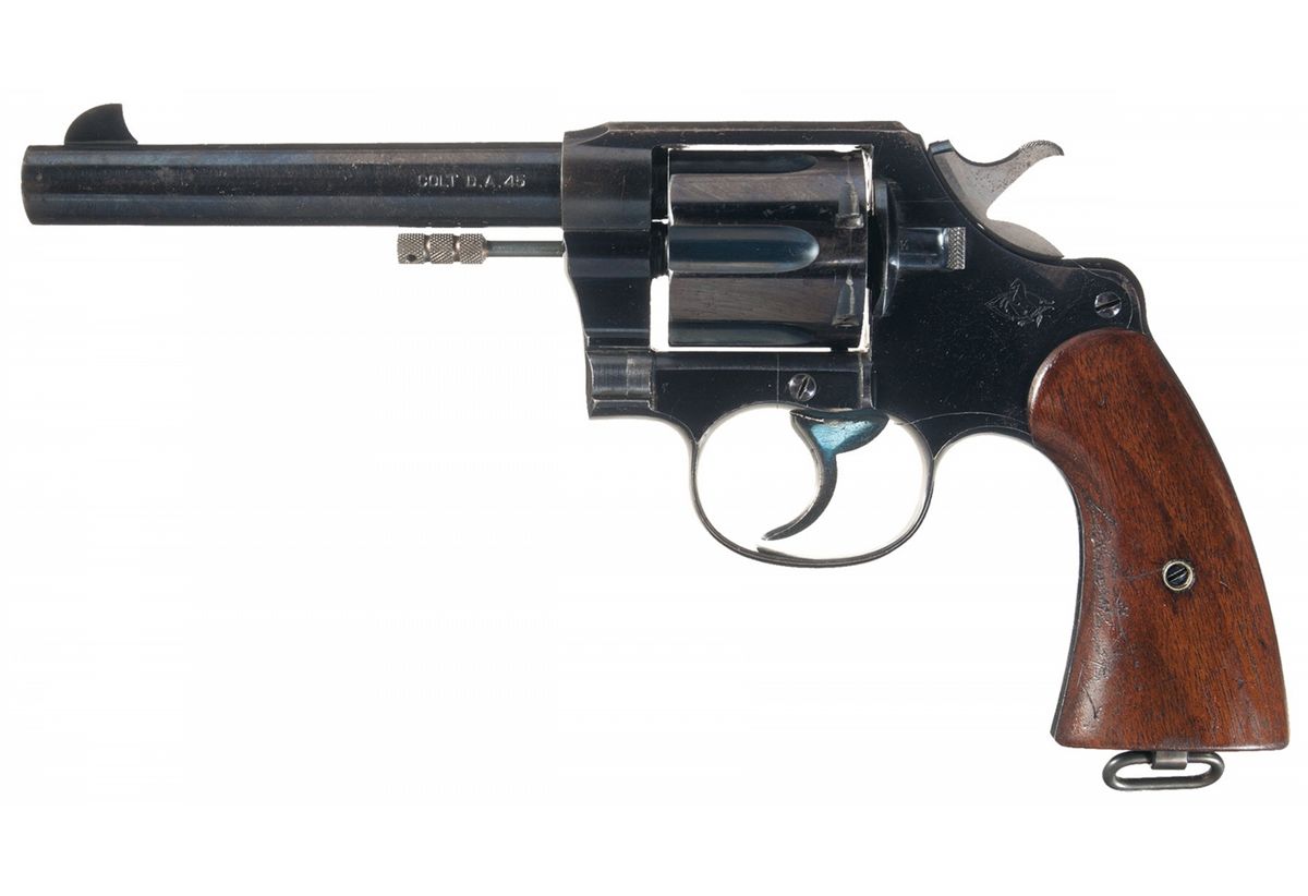 Delivered between 28 May 1909 and 13 September 1911, the Model 1909 revolvers were almost entirely shipped to the Philippines, where they filled the same niche as the Colt 1878/1902 revolvers, giving soldiers the firepower they needed to deal with the Moros at close range. Blade front and notch rear sights, with the two line Hartford address and patent dates (1884, 1900, 1905) on top of the barrel, "COLT D.A. 45" on the left side and "UNITED STATES PROPERTY" and "P R.A.C." on the underside. The left side of the frame has the Rampant Colt trademark surrounded by a stylized "C", with "F.B." and "R.A.C." inspector initials on the right. The butt is marked "U.S./ARMY/MODEL/1909" ahead of the lanyard loop and "No./33/641" behind it. All of the serial numbers match. Smooth two piece grips, with "R.A.C." stamped on the undersides.