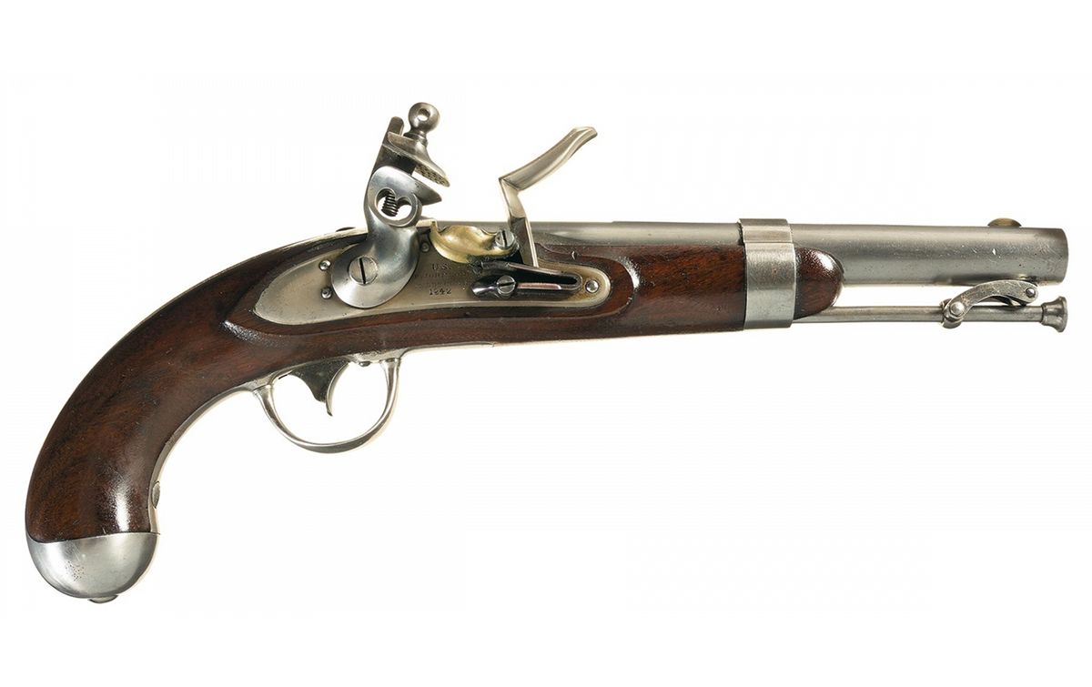 Model 1836 Flintlock Pistol manufactured by Robert Johnson of Middletown, Connecticut, c. 1842. The round .54 caliber smoothbore barrel has a steel swivel-mounted button head ramrod and is secured by a barrel band with strap extension that joins the side plate. The pistol has a brass half-moon front sight and oval-shaped rear sight on the barrel tang. The iron buttcap has an integral back strap. The lock plate has a beveled front and rounded rear with detachable brass pan and reinforced hammer. The barrel, barrel band/side plate, back strap/buttcap and trigger guard are National Armory Bright. The lock, barrel tang and trigger have a casehardened finish. The frizzen spring is niter blue. The stock is oil finished black walnut. The lock plate is roll stamped "U.S./R. JOHNSON/MIDDN CONN/1842". "US/JCB/P" is stamped on the top of the barrel perpendicular to the bore. A small "H" Ordnance sub-inspection mark is stamped on the left barrel flat, stock, trigger guard and pan. The left stock flat is stamped with the Ordnance sub-inspector's mark which consists of the script initials "JH" in an oval. The Ordnance final inspection stamp has the script initials "WAT" in an oval stamped vertically behind the sub-inspection mark. Robert Johnson manufactured an estimated total of 18,000 Model 1836 Pistols between 1836 and 1844. The Model 1836 Pistol was the primary handgun of the U.S. Dragoons and Mounted Rifles during the Mexican War. Model 1836 Pistols were still in service with state militia units at the start of the Civil War. A large percentage of the Model 1836 Pistols were converted to percussion ignition during the 1850s. The Model 1836 Pistol is generally considered to be the best made, best performing and most attractive of all U.S. military flintlock handguns.