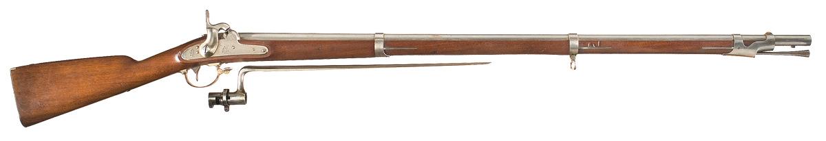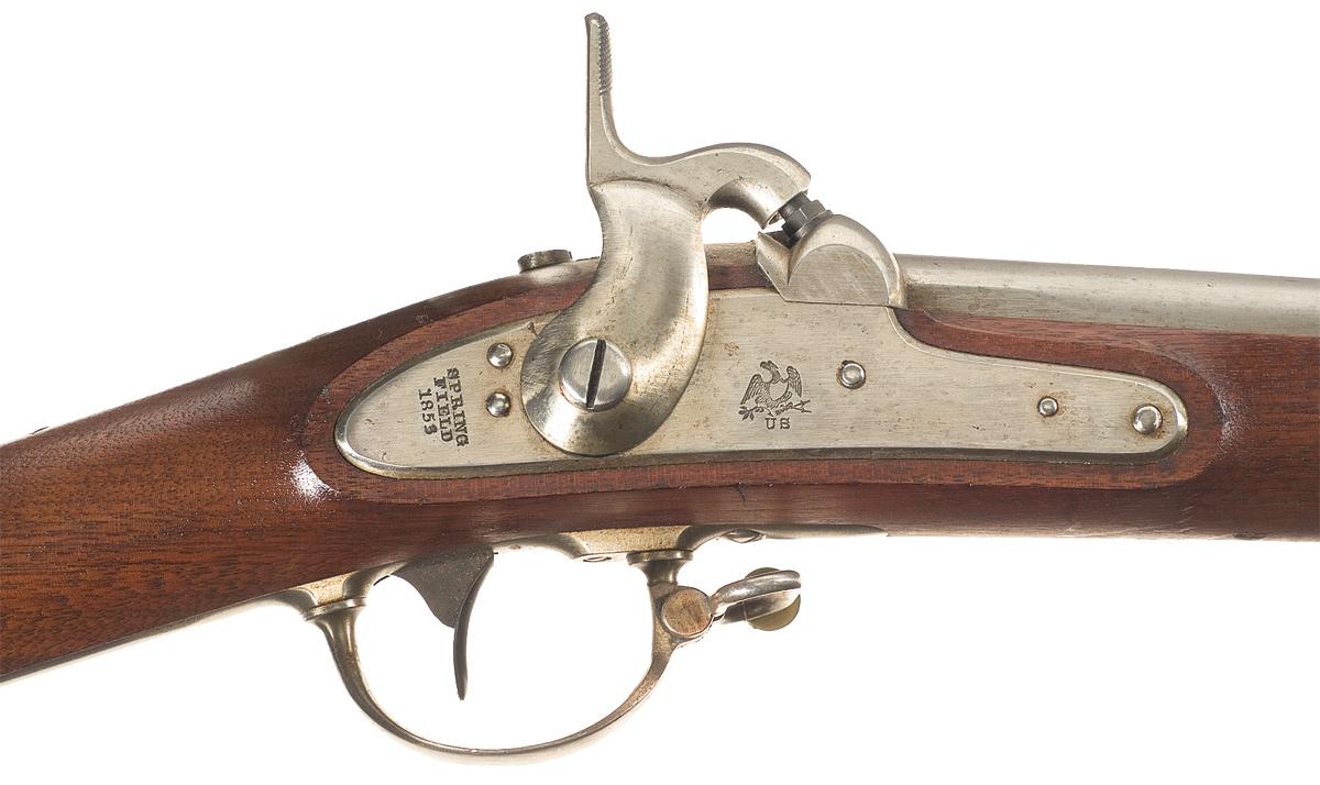 Manufactured from 1844 to 1855 Marked 1853 on barrel tang with the eagle shield over "US" in front of the hammer and "SPRING / FIELD / 1853" behind the hammer. The left side rear of the barrel is marked with the "V / P / eagle head" proofmarks and the left flat is marked with a small "T". Left side of stock has a "J.L" stamped cartouche. Fixed front blade sight mounted on the front barrel band, no rear sight (correct), bayonet lug mounted on the underside of the barrel, sling swivel on the middle barrel band and on the front of the trigger guard, and iron ram rod with a trumpet head. Three barrel bands with a sling swivel on the center band and steel buttplate marked "US" on the tang. Complete with "U.S." marked socket bayonet.