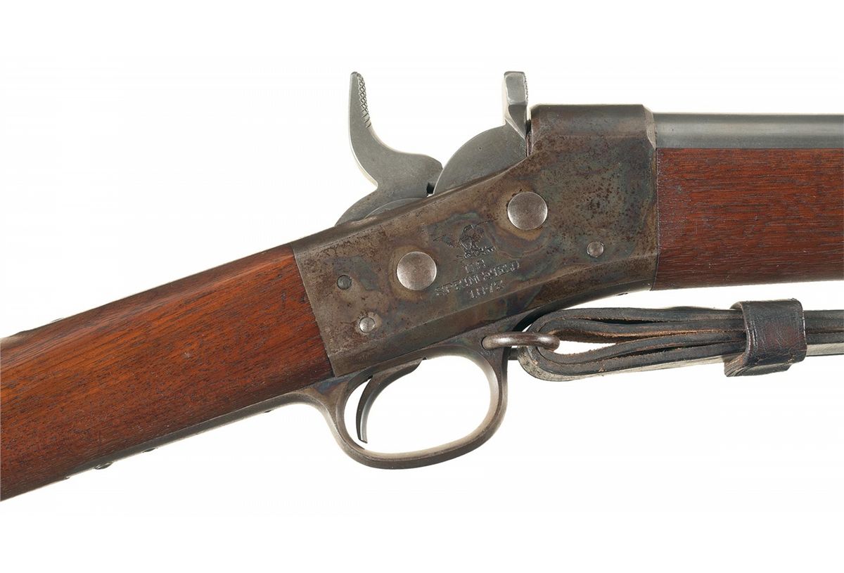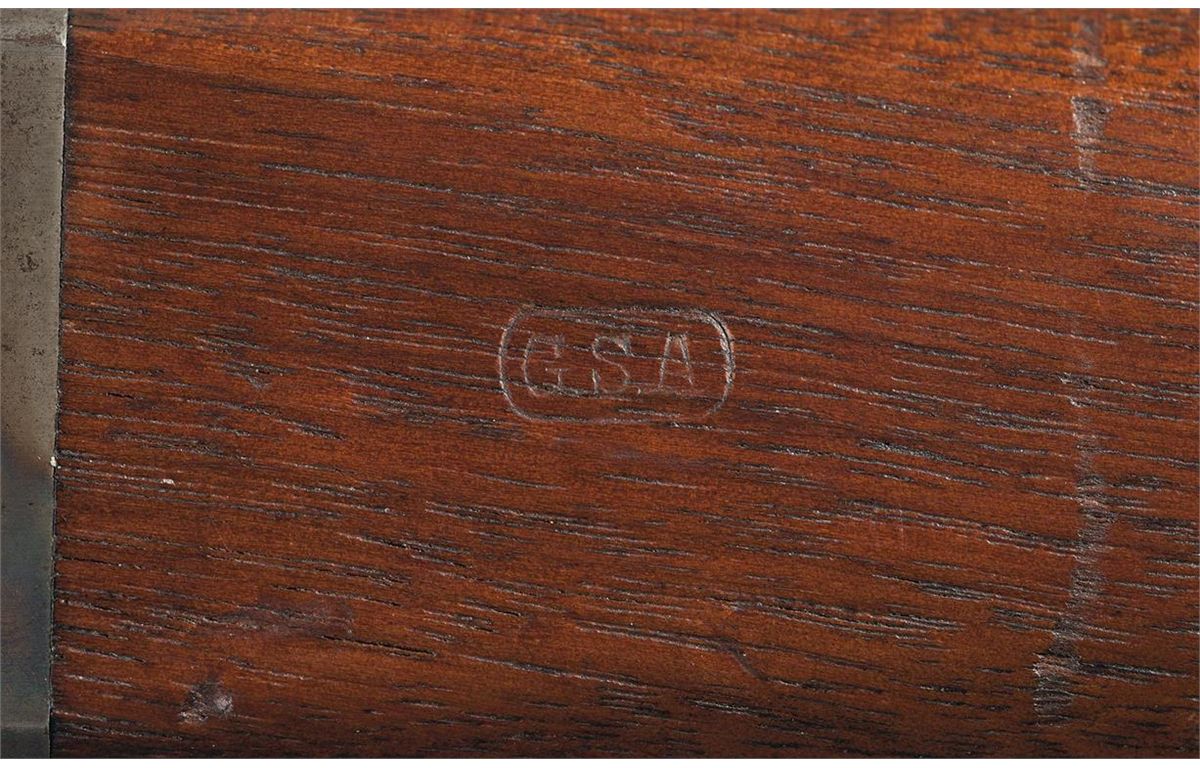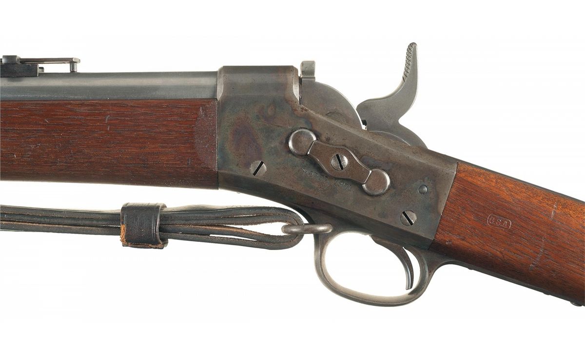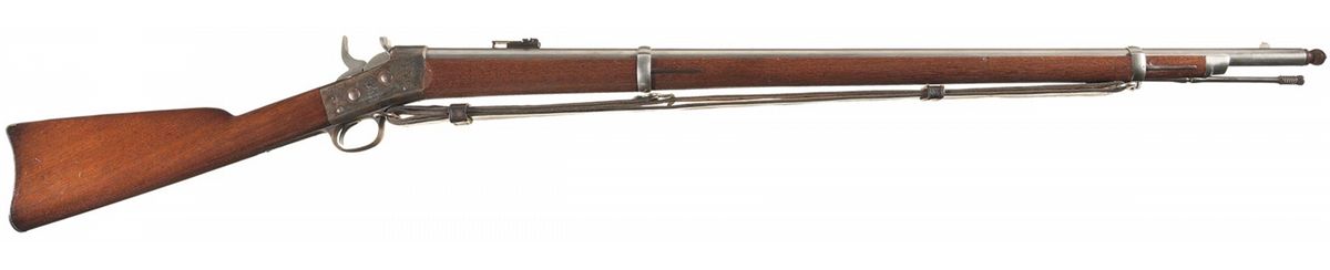 Manufactured by Springfield Armory on royalty agreement with the Remington Arms Co. from 1871 to 1872. The right side of the casehardened receiver is stamped with the eagle/shield motif above "U.S./SPRINGFIELD/1872" with the left side stamped "MODEL 1871". The upper tang has the two line Remington patent date (1864 and 1868) marking and the two barrel bands are marked with the letter "U". It has a ladder rear sight, cleaning rod, leather sling, and wooden muzzle plug. Casehardened receiver and trigger guard with remaining metal surfaces bright. Mounted with a smooth full length stock fitted with a buttplate stamped "US" on the tang. The left side of the wrist is stamped with a crisp "G.S.A" inspector cartouche.