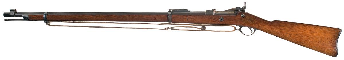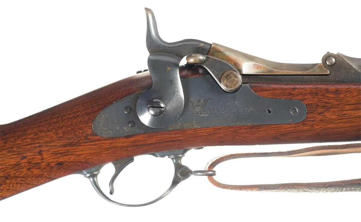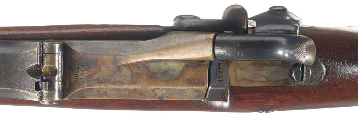This is an example of a Model 1884 rifle with a Buffington rear sight and a hooded blade front sight. The barrel, hammer, lock, trigger guard and buttplate are blue with casehardened breechblock and upper tang. The eagle/ shield motif is marked ahead of the hammer followed by "U.S. / SPRINGFIELD". The top of the breechblock is marked "US / Model / 1884". The left side of the barrel is stamped with the "V, P, Eagle head and P" proof and inspection marks. The top of the barrel at the breech is marked with the letter "A". Three click hammer tumbler, two piece trigger guard, grooved trigger, sling and stacking swivel, and iron ramrod. The stock has a clear letter "W" and a circled script "P" behind the trigger guard. The left side of the wrist has a script SWP cartouche with an illegible date. The buttplate tang is marked "US". Complete with a leather sling and a "US" marked socket bayonet with scabbard. The leather frog is marked "ROCK ISLAND / ARSENAL" and "J.F.S."