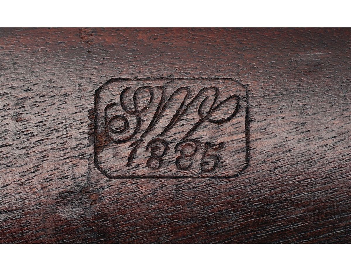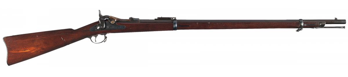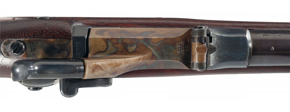 This is a nice example of an original Springfield Model 1884 Trapdoor rifle manufactured circa 1885. The casehardened low arch breechblock is stamped "US/MODEL/1873" and the lock plate has the eagle/shield and "U.S./SPRINGFIELD". The left rear of the barrel has "V/P/eagle head/P" proofs with "A" stamped on top. The action has a three click tumbler. The barrel bands are marked "U" and the buttplate tang is marked "US". The full length stock has a clear "SWP/1885" cartouche on the wrist and a circled script "P" behind the trigger guard. The rifle has a slotted cleaning rod.