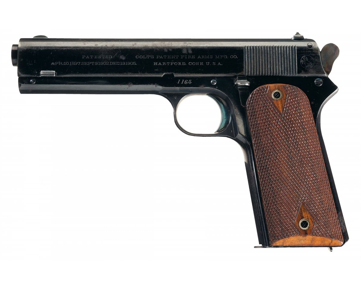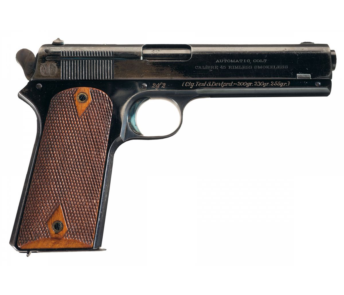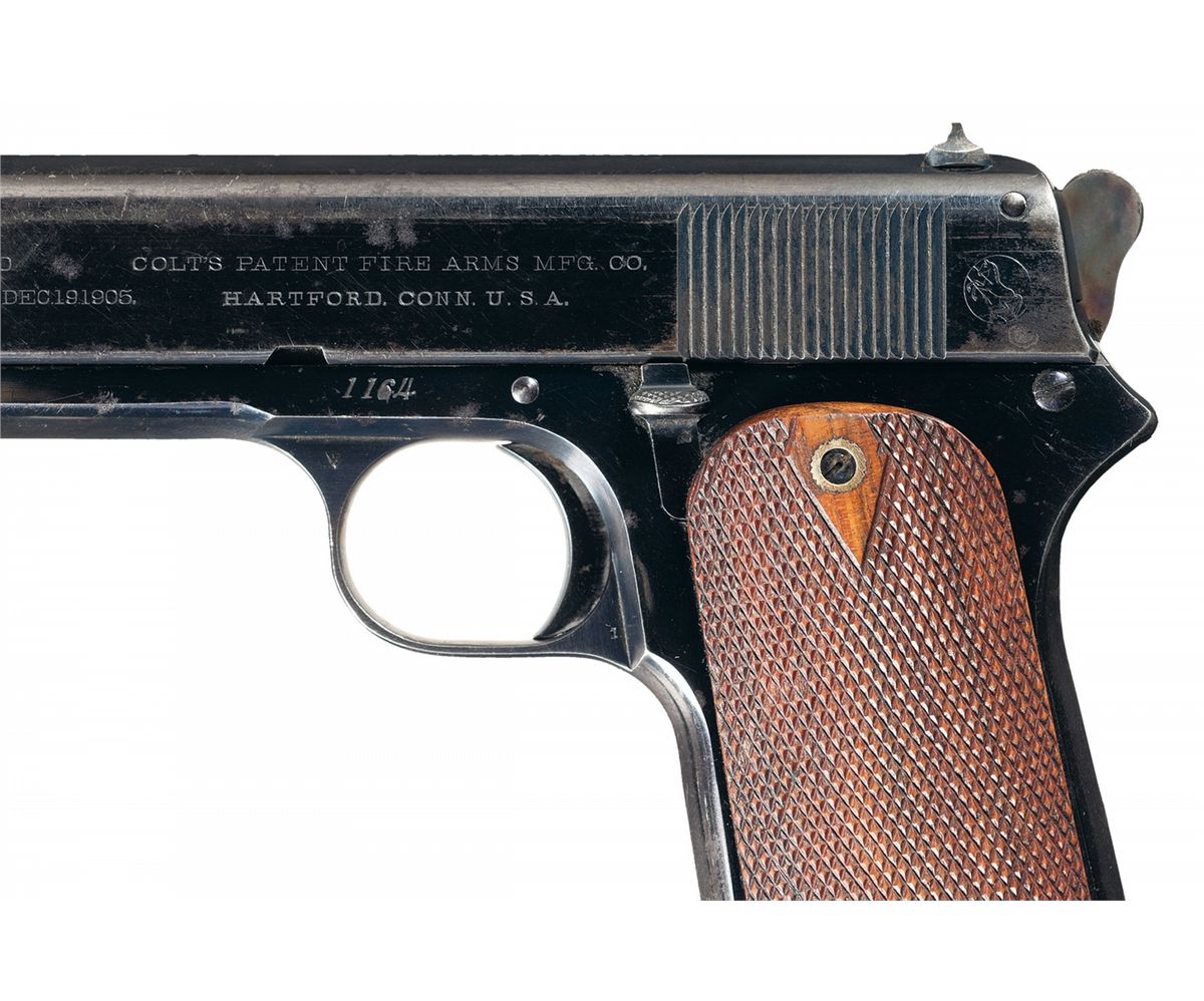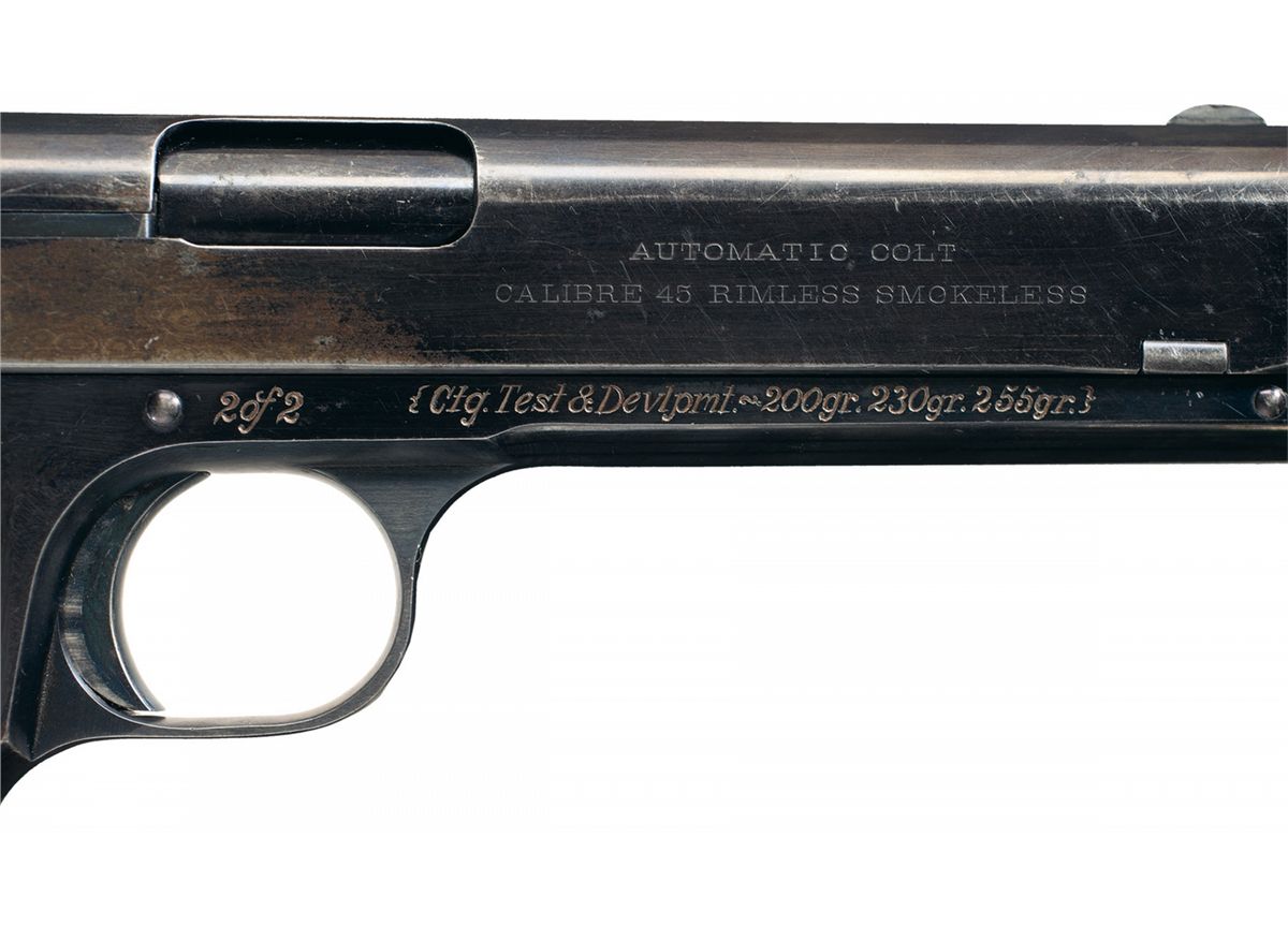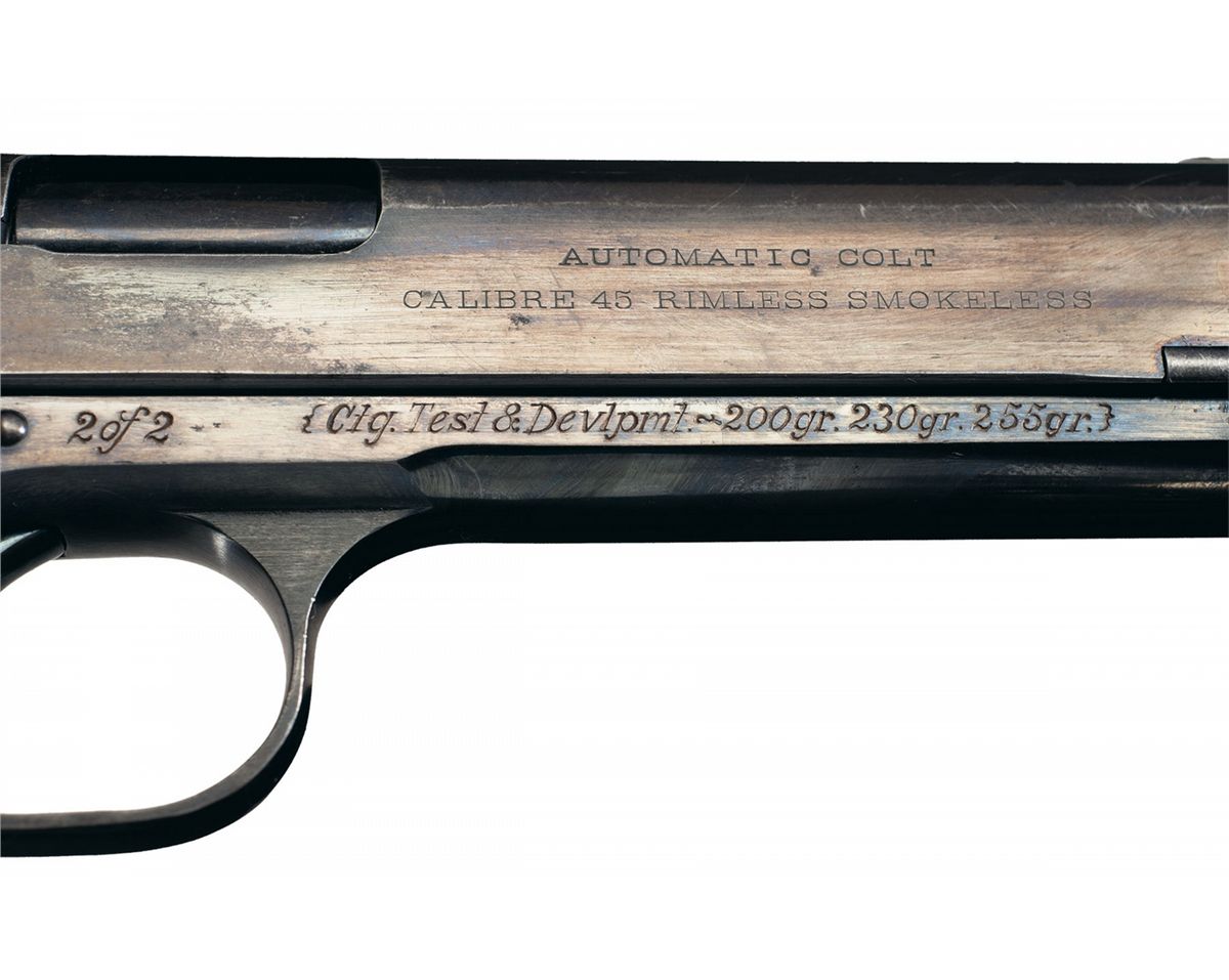 This pistol is number 2 of 2 that were used for testing the Winchester Repeating Arms Company 45 caliber ammunition. The development was done in conjunction with Colt Fire Arms Company. The tests were conducted using 200, 230 and 255 grain bullets. The casings were brass and the bullets were cylindro-spheric with a gilding jacket. After the official introduction in 1905, Frankford Arsenal started to develop a slightly modified .45 cartridge with a longer case and heavier copper-nickel jacket bullet of 230 grains, named "Cal. .45 Automatic Pistol Ball Cartridge Model of 1906" (FA M1906) to be on time for the upcoming tests planned by the Government for June 1906. Remington UMC submitted 230 and 255 grain 45 caliber bullets for testing. In addition to the two line caliber marking on the right side of the slide, the rear behind the serrations is engraved with a decorative, intertwined "WRAC" and the right side of the frame is engraved "2of2 { Ctg. Test & Devlpmt 200 gr. 230 gr. 255 gr.}". The right side of the slide is marked with the two line, two block 1897-1905 patent dates and address. The serial number is marked on the left side of the frame and the left upper trigger guard bow is marked with the Colt triangle "VP" proof and the number "1" on the lower left rear. Standard fixed sights, blue finish including the barrel and unmarked magazine, niter blue trigger and casehardened hammer. Fitted with checkered diamond pattern walnut grips with a diamond pattern around the screws.