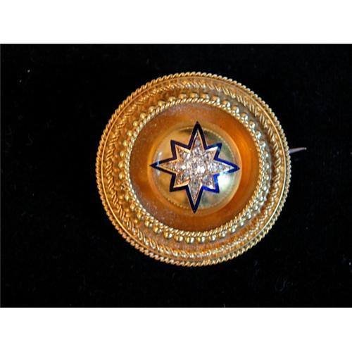 Very Fine Victorian Circa 1865 large round locket back brooch, Etruscan gold work granulation twisted border bombe'style center blue enamel star - one Old European Cut diamond rose cut diamond accents - approx .50 cts total weight. Reverse - extended pin stem tube hinge, c-catch locket back - Excellent condition! Outstanding piece!