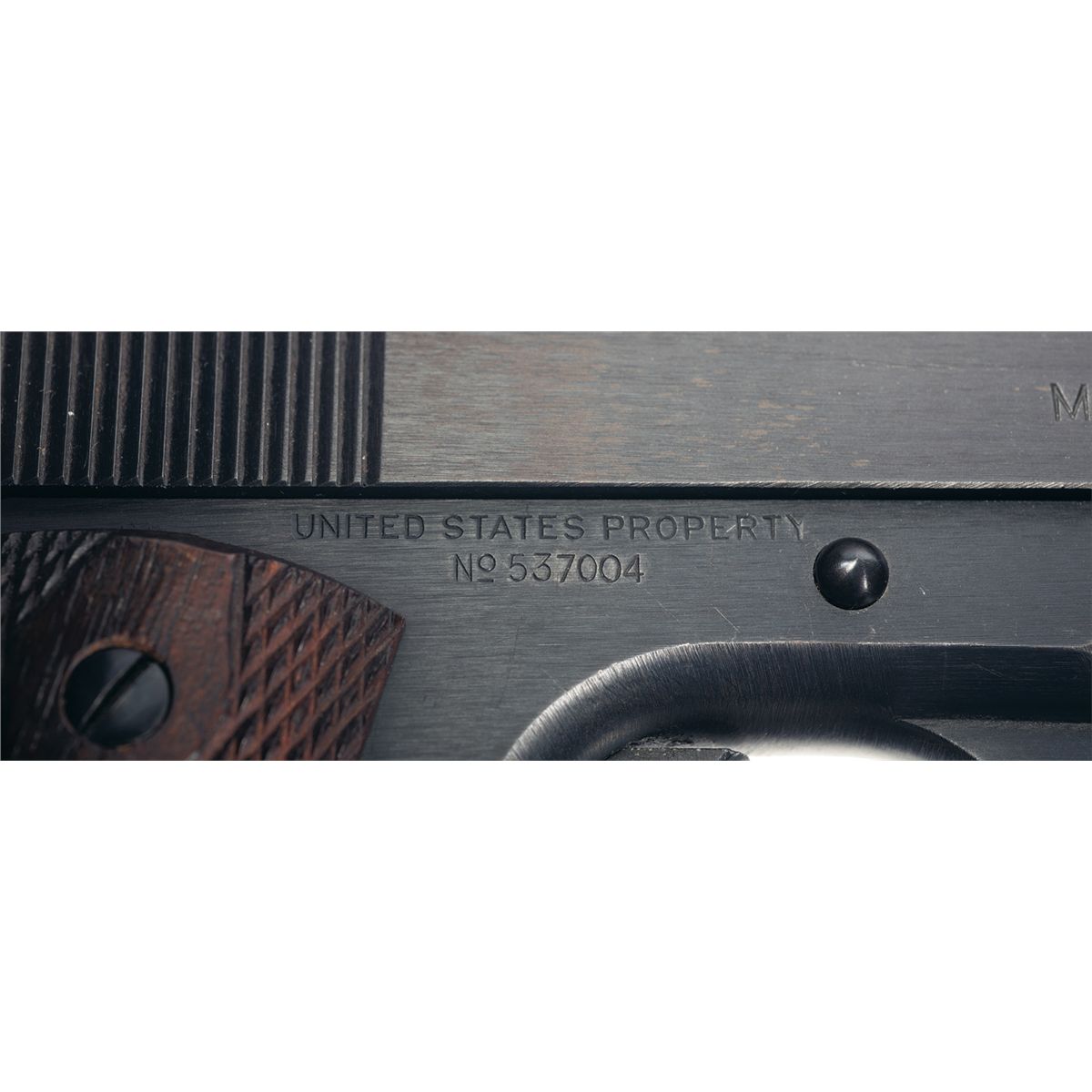 This exceptional U.S. Colt Model 1911 U.S. Army automatic pistol was manufactured between November 11 and November 29, 1918, and shipped to the Ordnance Depot at Bush Terminal, Brooklyn, New York. This pistol has the distinctive dark, brush blue, ''Black Army'' finish used by Colt on government contract model 1911 pistols from mid-1918 until the end of production in early 1919. The pistol has checkered, oil-finished black walnut stocks with diamonds surrounding the screw escutcheons. The receiver has the heart-shaped grip openings introduced about serial number 466705 (Clawson p. 200) and long hammer with rounded edge and borderless checkering that were adopted to speed model 1911 production in 1918. The safety lock is the mid-1918 style with thick thumbpiece. The right side of the receiver is roll-stamped: "UNITED STATES PROPERTY/No537004" in two lines behind the slide stop hole. The United States Property markings were moved from the left side of the receiver to the right side between serial number 500,000 and 510,000. The left side of the receiver is stamped with the Type I "Eagle Head/S17" Ordnance provisional Inspection mark adopted May 15, 1918. The top of the frame is stamped with a Colt "G" government contract mark behind the disconnector hole. The slide has the new style recoil spring housing adopted about serial number 29000. The right side of the slide is roll-stamped with the larger "MODEL OF 1911.U.S.ARMY" markings with "7/64" letters adopted about serial number 260000. The left side of the slide is roll-stamped with the 1897-1913 patent dates in a two lines followed by the Rampant Colt trademark and "COLT'S PT.F.A.MFG.CO./HARTFORD, CT.U.S.A." in a two-line block. The barrel has the same dark, brush blue finish as the other pistol components and is stamped with the connected letters "HP" on the chamber perpendicular to the axis of the bore. The pistol is complete with a WWI production two-tone magazine with flat base. The late production Colt model 1911 "Black Army'' pistols like this example have very distinctive finish, markings and features from the Colt model 1911 U.S. contract pistols made prior to the spring of 1918.