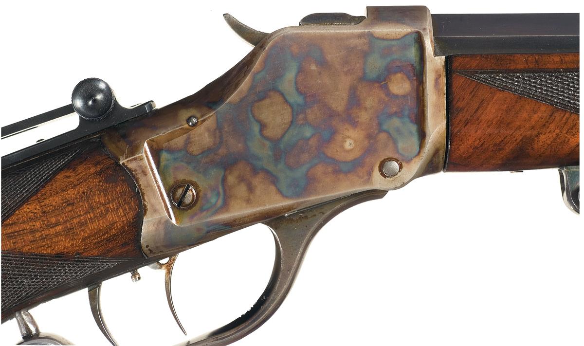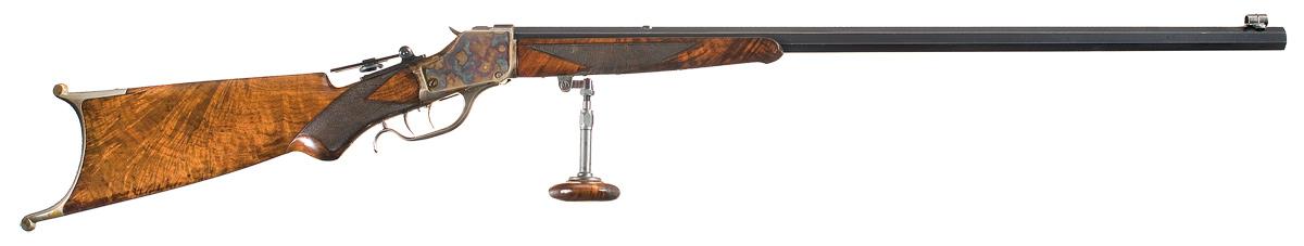 Condition: Excellent. The rifle retains 95% of the original blue and 90% plus original casehardened finish. The barrel has nearly all of the blue finish with some very minor edge wear and several insignificant handling marks. The bore is in perfect condition. The top and sides of the receiver have virtually all of the vivid case colors. The bottom of the lever and the lower receiver tang show careful handling wear and have a dove-gray patina. The Swiss buttplate has some minor flaking and retains about 85% of the original nickel finish. The barrel markings are crisp. The highly figured, Fancy Grain, walnut stock and forearm are in excellent overall condition with minimal handling wear and sharp checkering. There is one old and nearly un-noticeable, professional repair on the left edge of the forearm near the tip. The bottom and edges of the walnut palm rest show some minor handling wear but the palm rest remains in very fine condition. This is an outstanding example of a Special Order, Winchester High Wall Special Single Shot model target rifle with many of the features that were later found in the High Wall Schutzen Rifles.