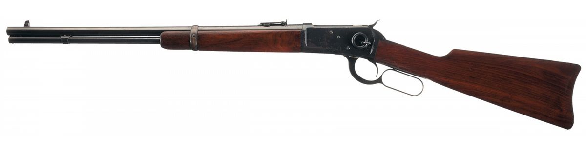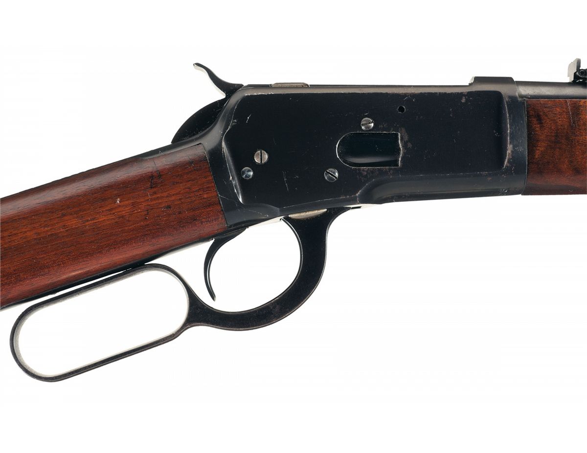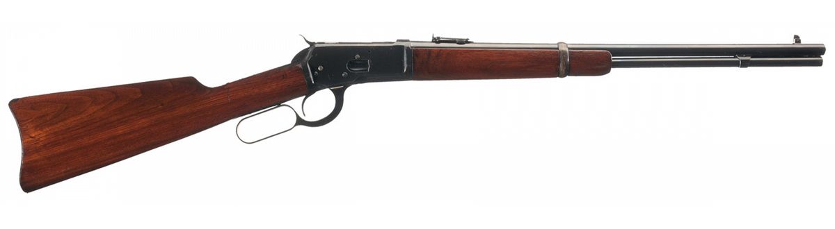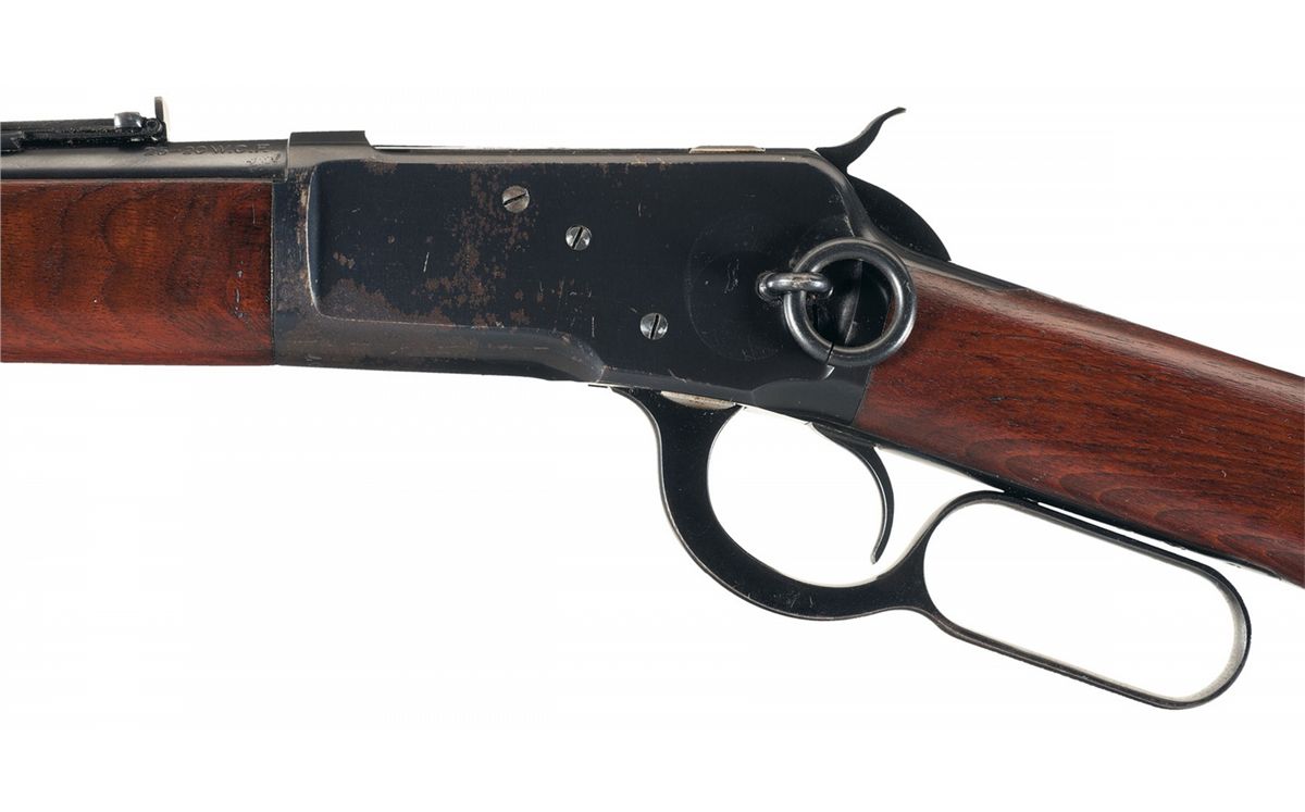 Manufactured in 1924. The left rear of the barrel is marked with the two line address/patent dates, "25-20 W.C.F." at the breech and the Winchester oval proof is marked on top of the barrel and receiver at the breech. The upper tang is marked "MODEL 92/-WINCHESTER-/TRADE MARK REG. U.S.PAT.OFF&FGN." , the serial number is marked on the bottom of the receiver and the number "26" is marked to the left of the lever. Pinned blade front sight and folding ladder rear carbine sight graduated to 200 yards, full length magazine, saddle ring and staple on the left rear of the receiver and mounted with as smooth walnut forearm and straight grip stock with a steel carbine buttplate.