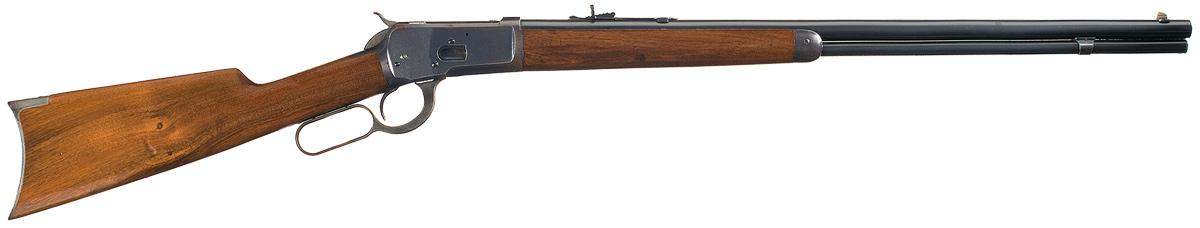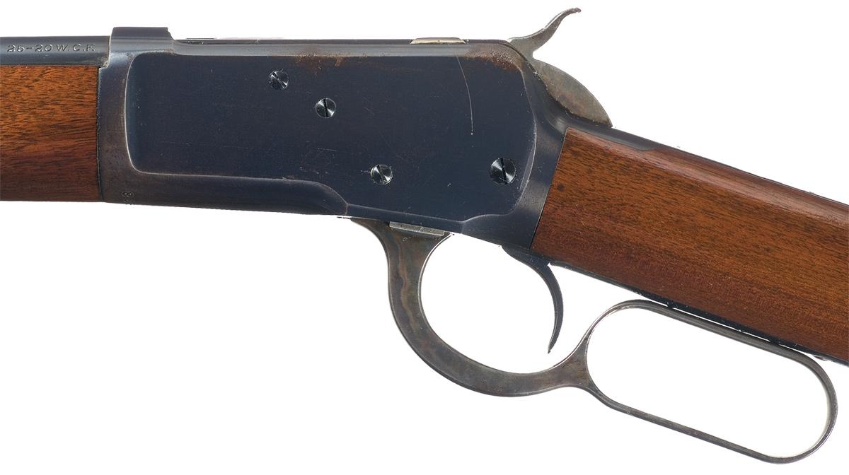 Manufactured in 1908, with a dovetail blade front sight and adjustable rear buckhorn sight, and a full length magazine. The top of the barrel is marked with the two line address/patent date, "25-20 W.C.F." on the left at the breech and the Winchester oval proof is on the top of the barrel and receiver at the breech. Three line model, maker, and trade mark marking on the upper tang and the serial number on the bottom of the receiver. Mounted with a smooth forearm and straight grip stock with metal forearm tip and smooth crescent steel buttplate.