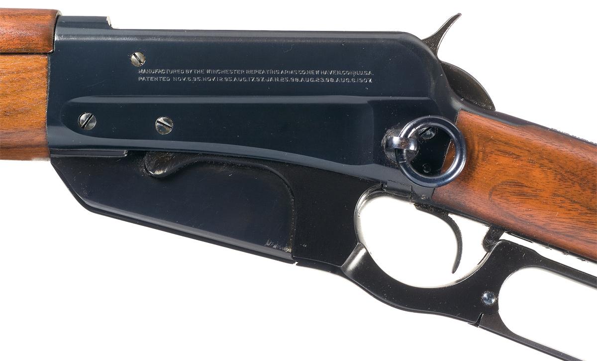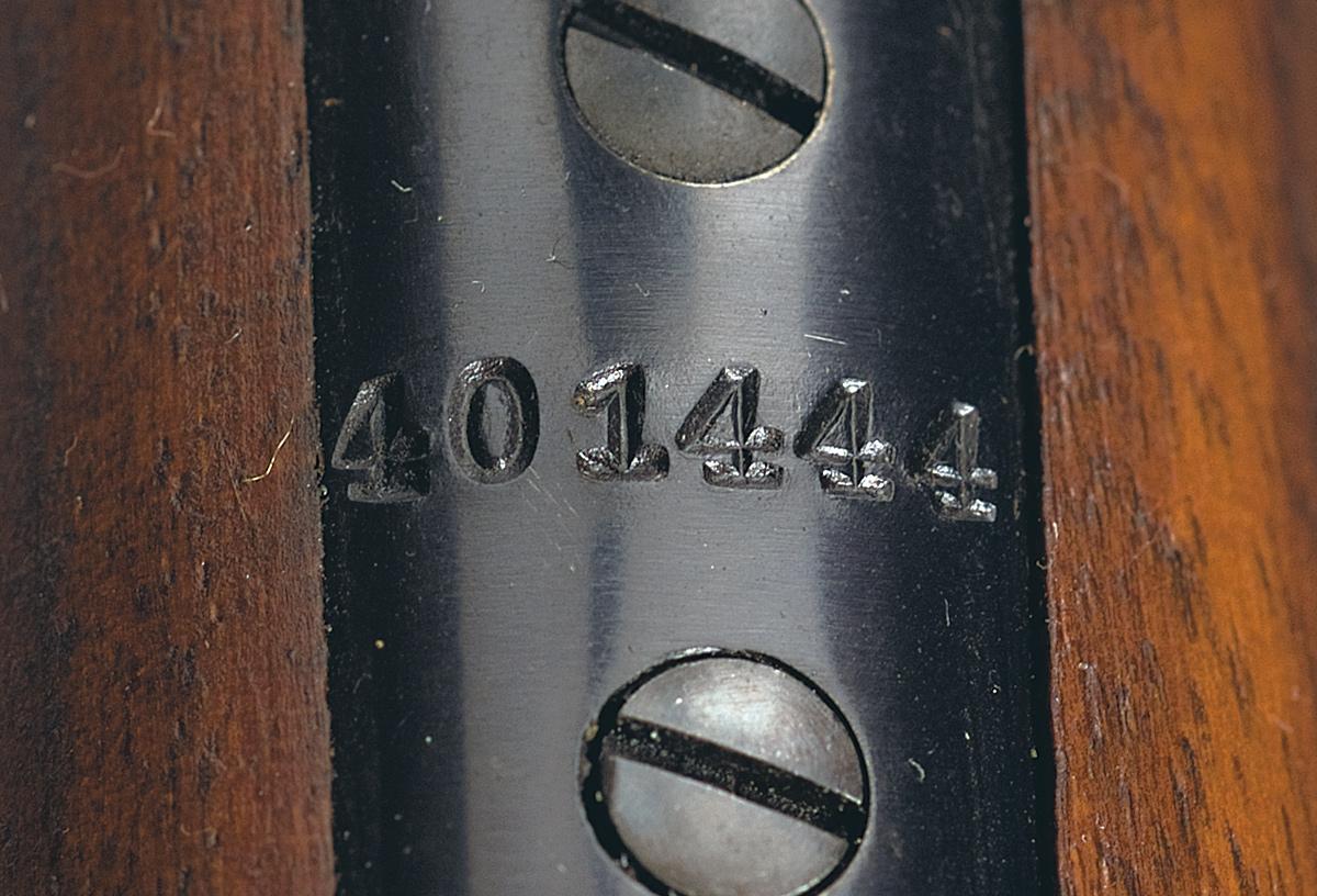This unused example of a Winchester Model 1895 Carbine was manufactured in 1920. The carbine has a blue finish on the barrel, frame, hammer, lever and buttplate. The black walnut stock, handguard and forearm have an oil finish. The forearm has military style grasping grooves. The barrel is fitted with a steel blade front sight and a military style, folding leaf, rear sight. A sling ring is mounted on the left side of the frame. The carbine style butt-plate has a sliding trap. The top of the frame is stamped with the Winchester, oval "W/P" proofmark above the two-line caliber designation ".30/ARMY". The upper tang is roll-stamped: "MODEL 1895/-WINCHESTER-/TRADE MARK REG.U.S. PAT. OFF & FGN." in three lines. The serial number is stamped on the lower tang. The left side of the frame is roll-stamped with the elongated, Winchester address and 1895-1907 patent dates. The original factory "ASSEMBLING SHOP TAG" is dated "9/9" and serial numbered to the rifle. The rifle has the consecutive serial number to Winchester Model 1895 Carbine "401,443" which is also offered for sale in this auction.