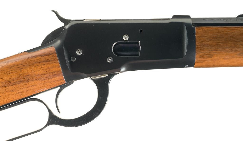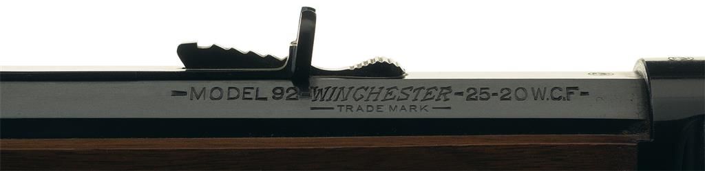 This is an outstanding example of a later production Winchester Model 92 rifle that was manufactured in 1927. The upper left rear barrel flat is marked "-MODEL 92 -WINCHESTER/TRADE MARK- 25-20 W.C.F". The two-line address is on the opposite, and the Winchester oval proof is marked on the top barrel flat and receiver at the breech. The upper tang is marked "WINCHESTER/TRADE MARK/MADE IN U.S.A." and the serial number is marked on the bottom of the receiver. The barrel is fitted with a dovetailed blade front sight with a brass bead and an adjustable rear buck horn sight. Full magazine, all blue finish and mounted with a smooth walnut forearm with a metal forend cap and straight grip stock with a crescent buttplate. Comes with an original box with the correct end label for rifle configuration, "ALWAYS/Use WINCHESTER Ammunition" label on the lid, and cardboard dividers.