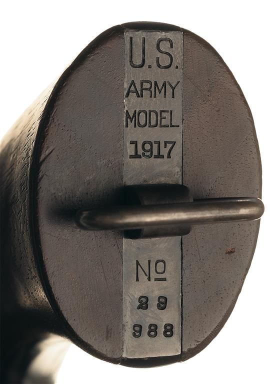 This is an excellent example of a S&W Model 1917 U.S. Army revolver. The barrel features the two line address/patent date marking on top, "S&W DA 45" on the left side and "UNITED STATES PROPERTY" on the underside. The left side of the frame has a "GHS" inspection mark. The butt, which has a lanyard ring, is stamped "U.S./ARMY/MODEL/1917" and "No./29/988." The cylinder and barrel are numbered to the gun and the crane and frame having matching assembly numbers (3777). Blue finish with casehardened hammer and trigger and fitted with smooth walnut grips with the right panel numbered to the gun. The revolver comes with a leather U.S. flap holster stamped "G&K/1917/AG" and four half moon clips.
