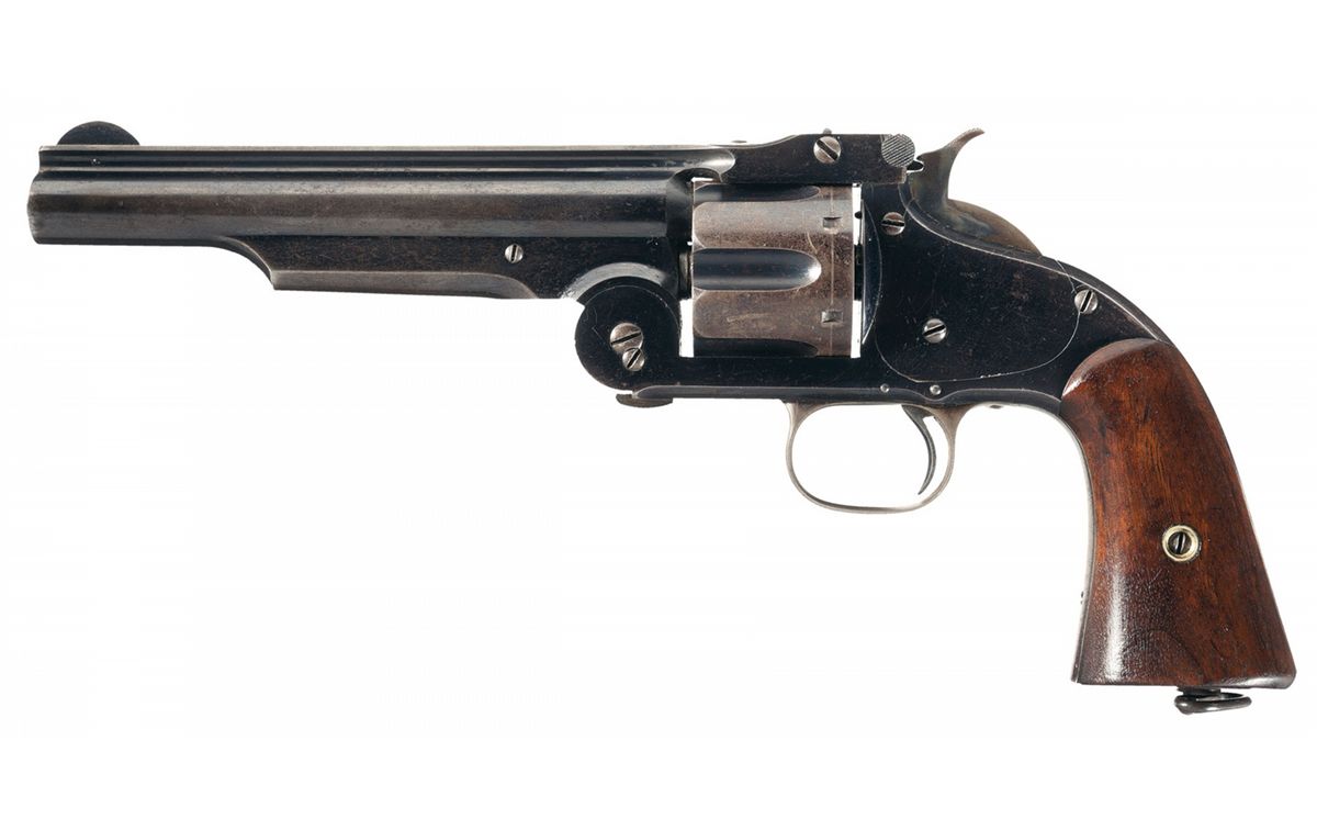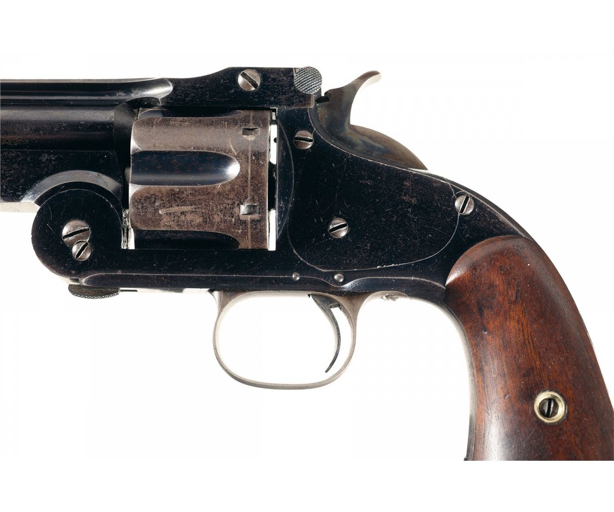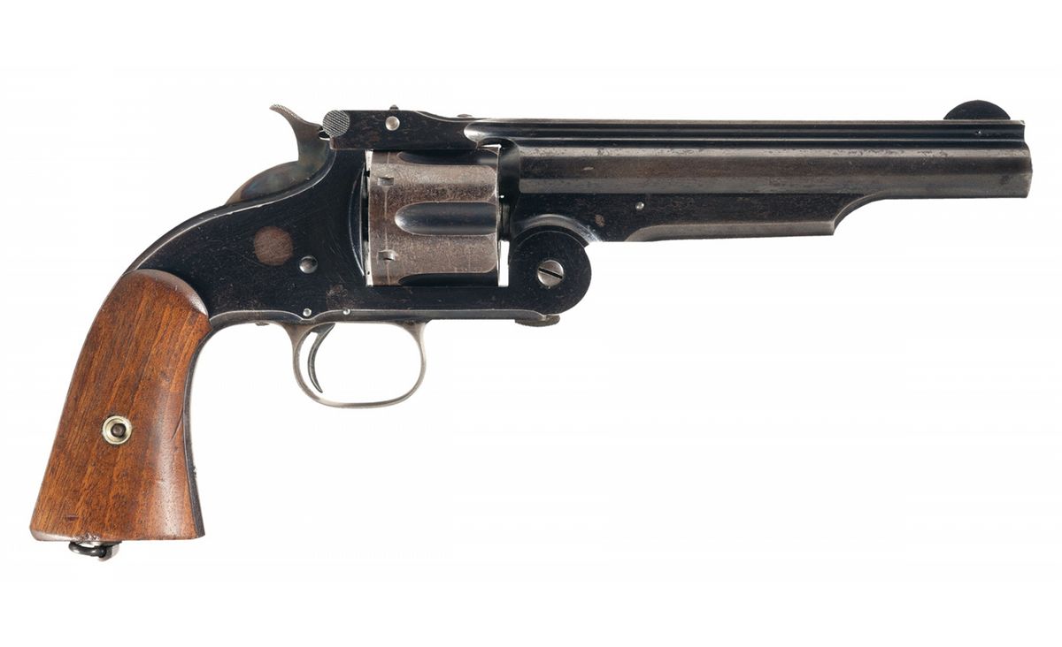 Identical to American Models except for the barrel address and chambered for the 44 Russian rather than the 44 American. This is a commercial revolver numbered within the American Model serial range. Smith & Wesson manufactured a total of 26,000 1st Model Russians between 1871 and 1874. The First Model Russian was manufactured with standard 8 inch barrel with 6 inch and 7 inch barrels being a less common speical order. This revolver has an ultra rare 6 inch barrel. The included factory letter states that this revolver was shipped on September 18, 1873 and delivered to Smith & Wesson's largest distributor, M.W. Robinson of New York City. Pinned blade front sight with notched rear sight on barrel latch. The top of the rib is marked "SMITH & WESSON SPRINGFIELD. MASS. U.S.A. PAT. JULY 10.60. JAN. 17. FEB. 17. JULY. 11 65 & AUG. 24. 69. RUSSIAN MODEL". The serial number is on the butt with the assembly number "Z108" one the rear face of the cylinder, barrel latch and barrel. Blue finish with casehardened hammer and trigger guard with smooth grips and lanyard swivel on the butt. The right grip panel is numbered to the gun. Provenace: The Gary Garbrecht Collection.