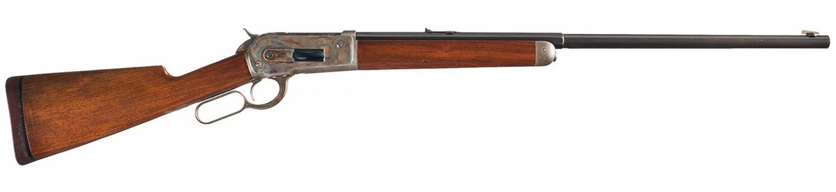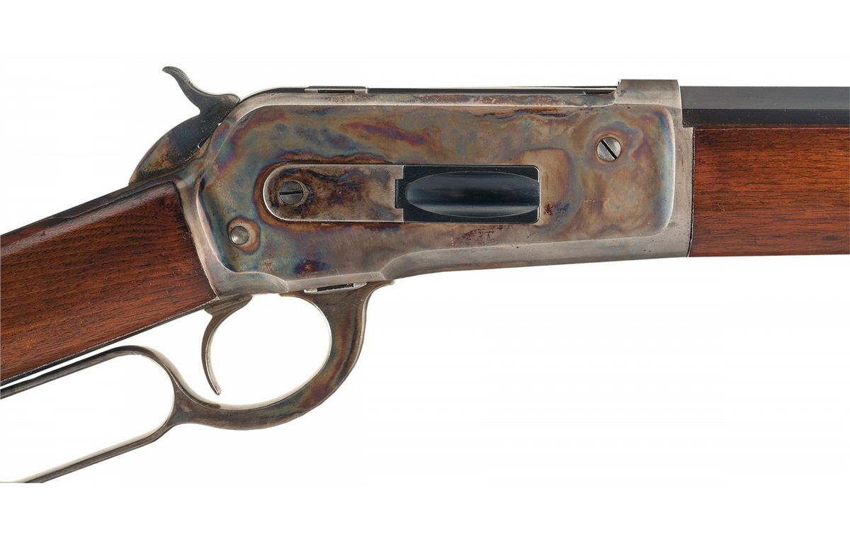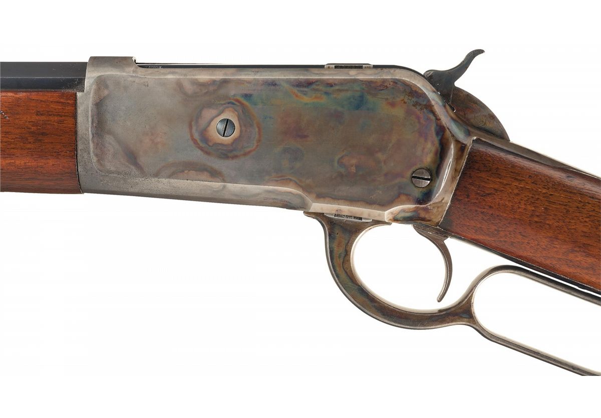 Excellent plus to near mint. The barrel retains 98% original blue finish showing only slight high edge wear and minor collector type handling marks. The metal surfaces are smooth and edges are sharp. The receiver retains over 90% of the original brilliant casehardened finish with thinning on the under side of the receiver and a few mild surface scratches on the left. The hammer, lever, and endcap all exhibit equally brilliant case colors. The extractor and loading gate retain 98% plus of the stunning fire-blue finish. The wood is near mint with all of the original varnish remaining showing only a few light handling marks overall. This is an exceptional special order Model 1886 in near pristine condition and would be difficult to improve on.