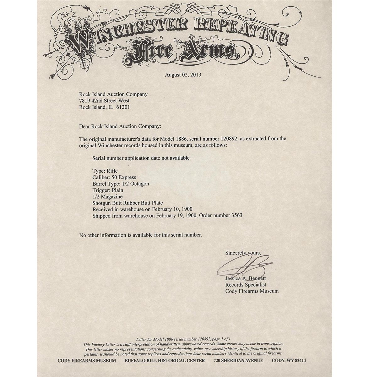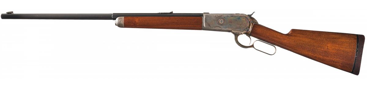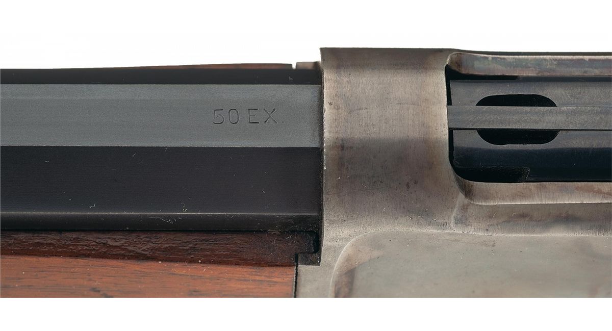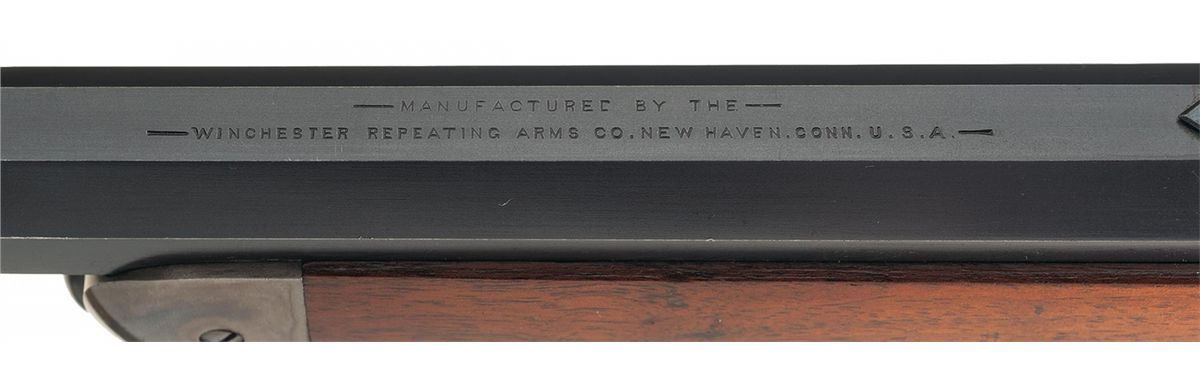 This is an outstanding example of an original unaltered and near mint Model 1886 rifle with many special order features. Factory letter state this rifle was received in the factory on February 10, 1900 and was shipped February 19, 1900 to order number 3463 and confirms configuration and all features are totally original. This rifle has a special order 26 inch half octagon barrel, fitted with a nickel-silver blade front sight and graduated selective folding leaf rear sight. The top barrel flat ahead of the rear sight is marked "- MANUFACTUED BY THE-/-WINCHESTER REPEATING ARMS CO. NEW HAVEN.CONN. U.S.A.-" and "50 EX" at the breech. The upper tang is marked with the early style "-MODEL 1886-" marking, and the lower tang is marked with the serial number at the end and "-PAT.OCT.14.1884./JAN.20.1885.-" directly behind the trigger. The barrel has the rare special order push button half magazine. The barrel is blue, receiver, hammer, forend cap, and lever casehardened, and the extractor and loading gate have a fire-blue finish. Mounted with a smooth walnut forearm and straight grip stock with a special order solid rubber recoil pad.