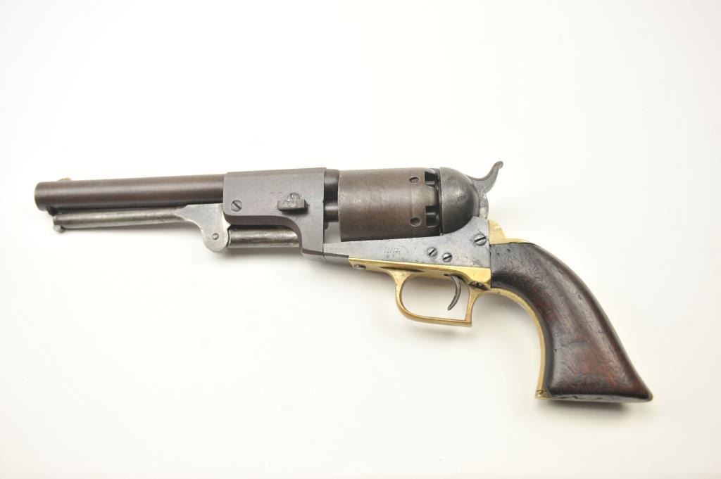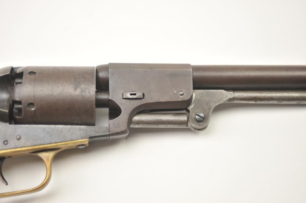 Outstanding and fully authentic Colt 1st model dragoon 2nd contract for replacement of Walker’s aka “Fluck” variation S/N 2626. This early Colt shows considerable original blue and case hardened finish mixed in an uncleaned natural patina. 30%-50% original scene with figures mostly visible but light with U.S.M.R. and Colts patent also showing. P inspections visible and the grips show cartouche on the left bottom. Some bright blue under the lever and two digit assembly number (Correct) on the ramrod. Matching walker size numbers on visible parts. The grips are very good other than chips and small losses at each toe. The action works well and markings and interior are crisp and well cared for showing just minor carry and use. An absolutely no apologies necessary early Colt that are normally found. “Used Up” on the western frontier and fully inspected and cartouched examples are rare with condition. Suitable for a sophisticated Colt or martial arms collection. Provenance: this Dragoon was used by Jonathan V. Morgan during the Civil War. He was born in Covington Township Tioga County, PA on March 1, 1838. He enlisted in Co. E. 1st Penn. Reserve and was taken prisoner at Gaines Hill. He was paroled and rejoined his regiment at Alexandria, VA. He served in all the engagements which “The Bucktails” participated. He was wounded at Gettysburg and promoted several times for gallantry. The family legend is he brought this Dragoon home with him and a notarized affidavit by his great, great, great nephew dated Nov. 25, 1995 is included. (Antique) Est.: $25,000-$50,000