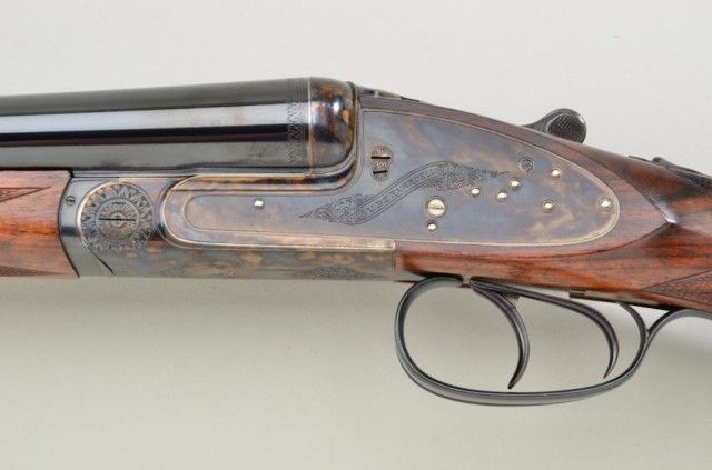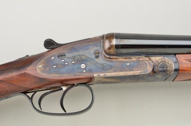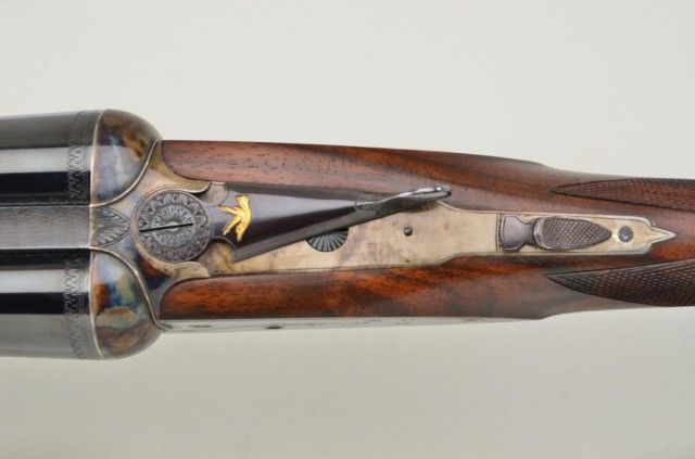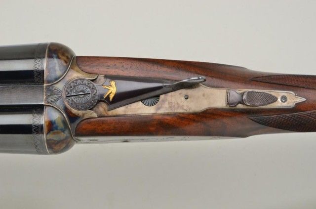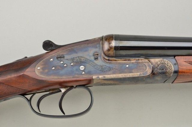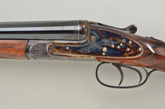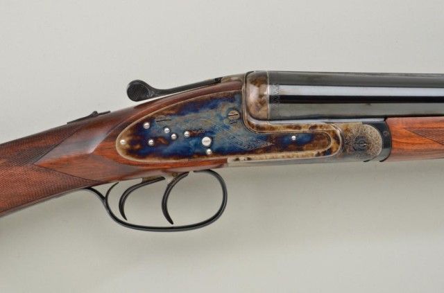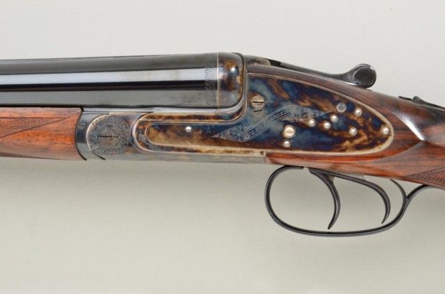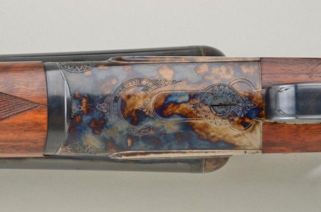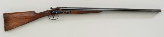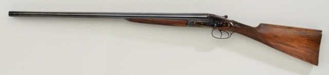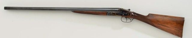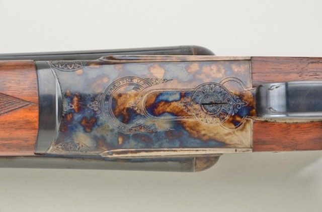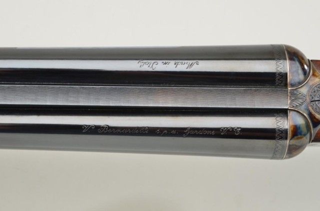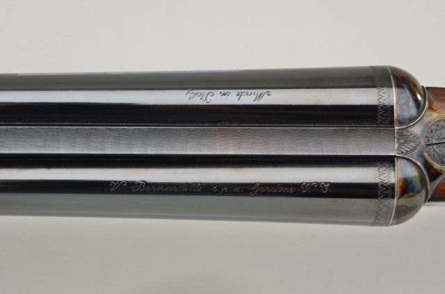 Outstanding cased Bernardelli full sidelock Holland VB Model SxS hammerless shotgun, 12 gauge, 2-3/4” chamber, left choke is .11 IM, right choke is .07 IC, bore .729, 28” chopper Lump barrels, length of pull 14-1/4”, heel2-1/4”, comb 1-1/4”, cast heel is 5/8” and toe ¼”, wall thickness left is .29, right is .32, blue and case hardened finish, deluxe checkered wood stocks, #3439. This gun is in overall excellent condition showing approx.98%+ of its original blue on the barrels and case colors on the receiver, double triggers, fine bores, crisp actions, fine markings, fine wood stocks with delicate checkering including the butt that has been woodcheckered en suite with the wrist of the butt stock and the fore end. The lined suitcase style casing is also in overall fine condition. Est.: $5,000-$10,000.