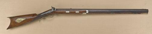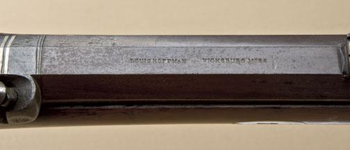 Outstanding half-stocked heavy barrel percussion plains type rifle by Louis Hoffman, Vicksburg, Mississippi, .60 cal., 33-1/2” barrel, brown finish to barrel, case hardened back action lock, checkered woodstock with circular engraved patchbox and double keyed barrel attachment to stock. This gun is in overall excellent condition showing the majority of its brown finish on the barrel, strong traces of case color onreceiver, side plate and hammer, Louis Hoffman marked lock plate, very good to fine bore, crisp action, sharp markings, single trigger, brass trigger guard, butt plate and ramrod ferrules; wood ramrod, engraved starinset into left side of butt stock; deluxe grained and checkered wood stock with some scattered scratches and mars from storage but otherwise retaining majority of finish. A beautiful half-stocked rifle made by awell-known Southern maker. Louis Hoffman of Vicksburg was a main supplier to the Confederacy and when Vicksburg fell he was put on trial for arming the insurgents. This rifle was specially built in .58 caliber