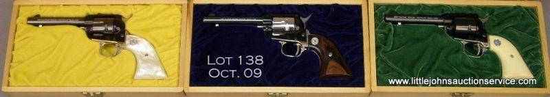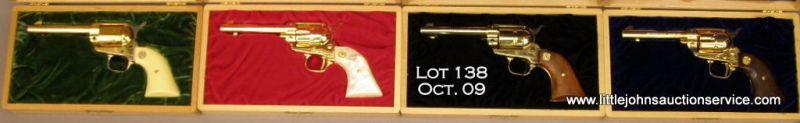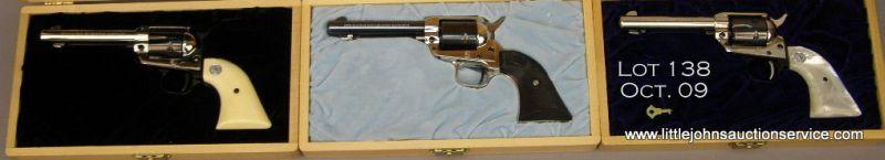 Outstanding lot of entire10 Colt Kansas Trail Series Commemorative .22 SAA revolvers, all cased and all in near mint condition showing little handling. This lot includes the following Commemoratives:• “Fort Hayes”, 1870-1970, .22 cal., 4-3/4” barrel, blue & nickel finish, checkered hard rubber grips, #374FH. • “Coffeyville”, 1866-1966, .22 cal., 4-3/4” barrel, gold finish, smooth wood medallion grips,#374KC. • “Chisholm Trail”, 1867-1967, .22 cal., 4-3/4” barrel, blue finish with nickel trigger guard and backstrap, faux pearl medallion grips, #374CH. • “Wichita”, 1864-1964, .22 cal., 4-3/4” barrel,gold finish, faux pearl medallion grips, #374KW. • “Fort Larned”, 1869-1969, .22 cal., 4-3/4” barrel, blue and nickel finish, faux pearl medallion grips, #374FL. • “Fort Riley”, 1870-1970, .22 cal., 4-3/4”barrel, nickel and blue finish, faux ivory medallion grips, #374FR. • “Dodge City”, 1864-1964, .22 cal., 4-3/4” barrel, gold finish, faux ivory medallion grips, #374KD.