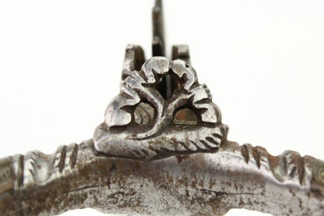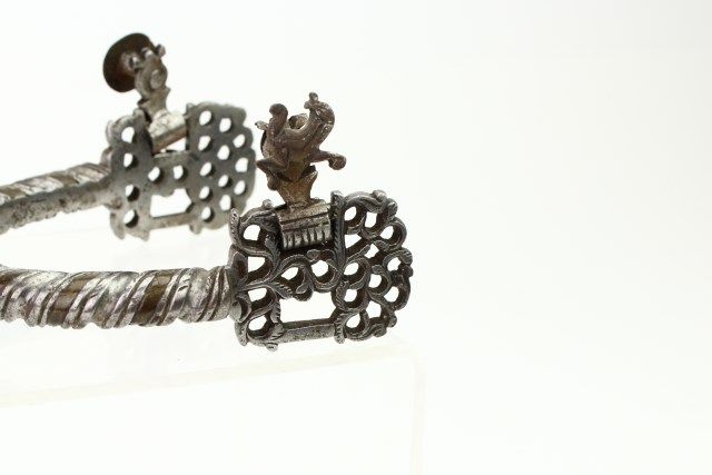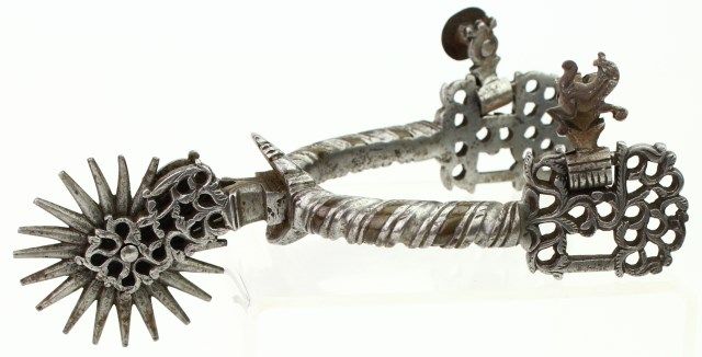 with filigree band, right side with animal figure button, 1 3/4" shank open filigree, 2" rowel. Early masterpiece in metal overall 6" long. Est. 400-800