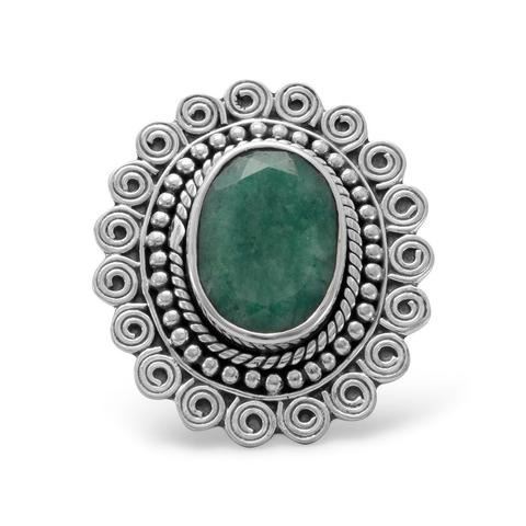 Faceted oval dyed beryl ring with oxidized scroll and bead design edge. Dyed beryl measures 13.5mm x 10mm.