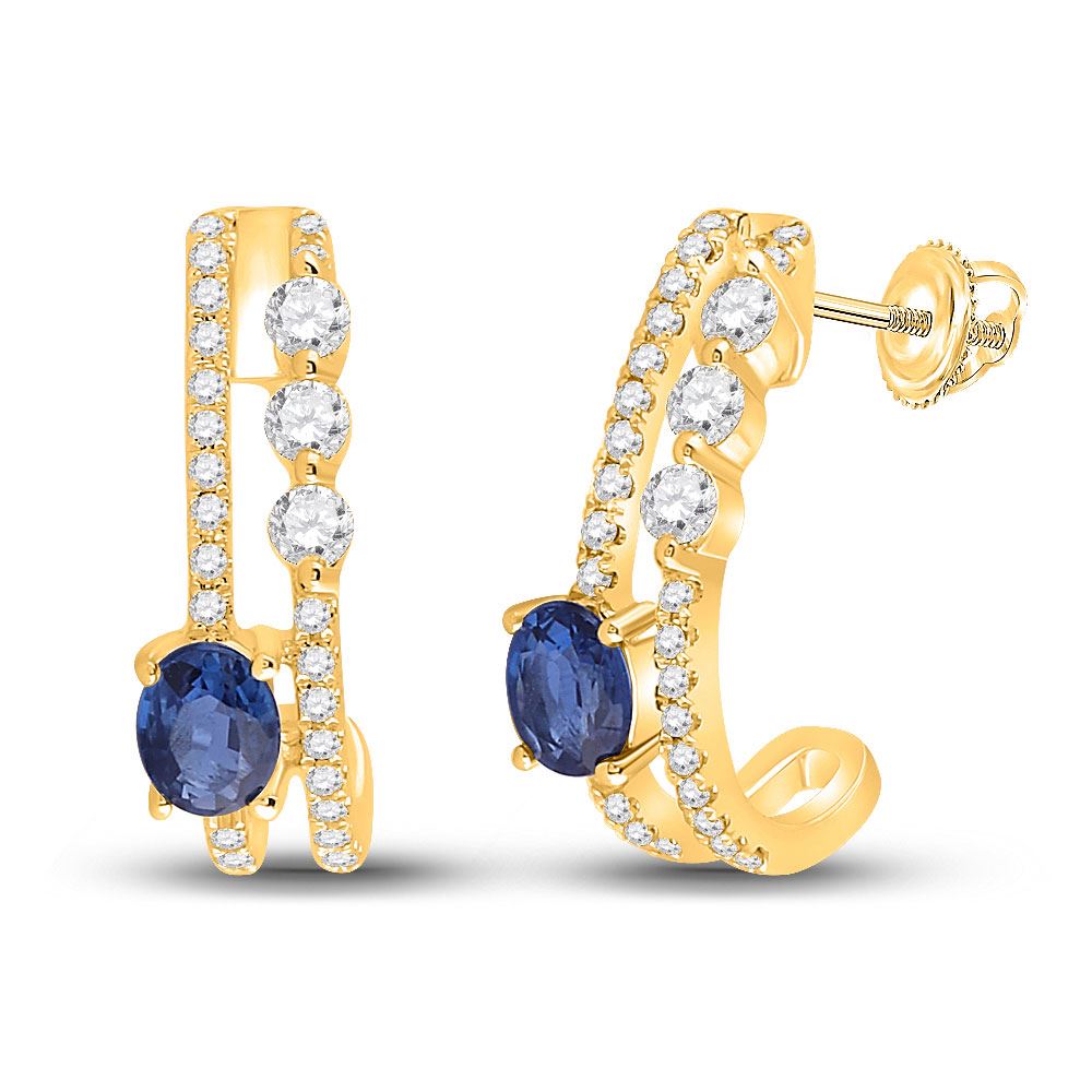 14kt Yellow Gold Womens Oval Blue Sapphire Diamond J Hoop Earrings 3/4 Cttw