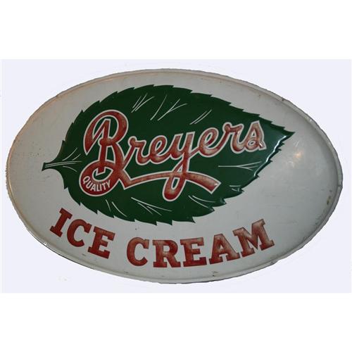 Metal Breyers Ice Cream sign in oval shape measures approx. 31" x 50".  Fading of graphics.  Paint spots on left side.  Overall soiling with surface scratches.
