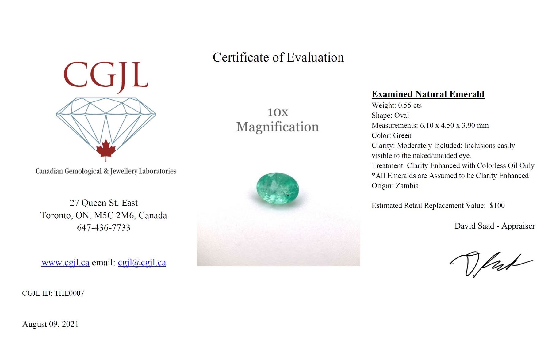 Weight: 0.55 cts Shape: Oval Measurements: 6.10 x 4.50 x 3.90 mm Color: Green Clarity: Moderately Included: Inclusions easily visible to the naked/unaided eye. Treatment: Clarity Enhanced with Colorless Oil Only *All Emeralds are Assumed to be Clarity Enhanced Origin: Zambia.