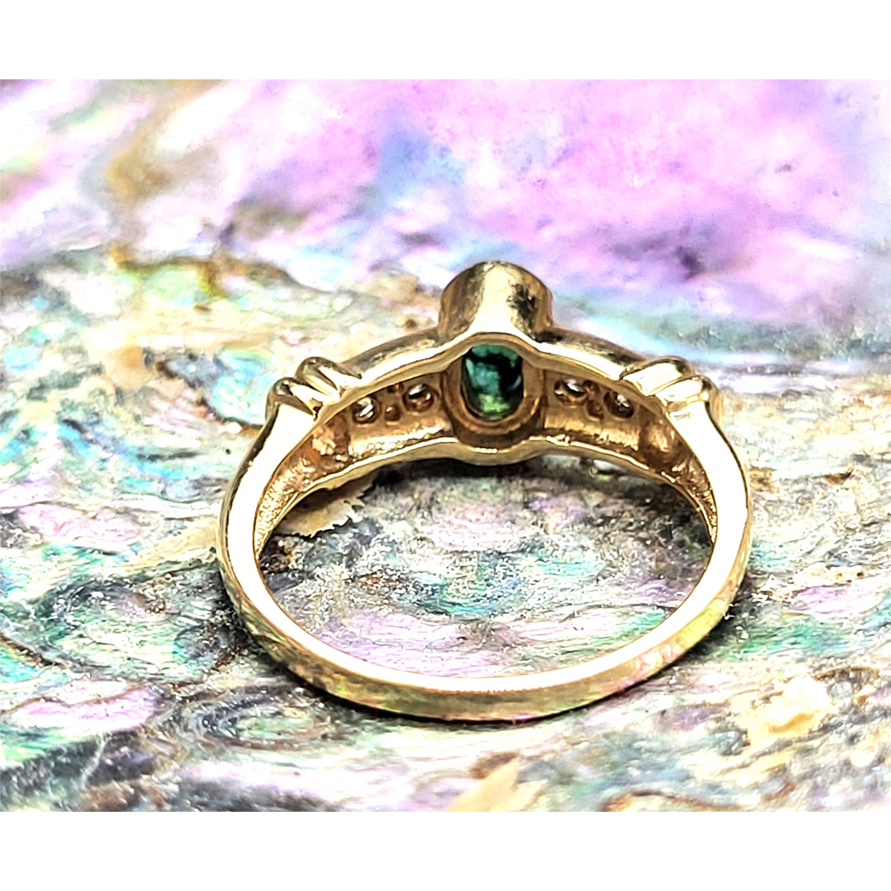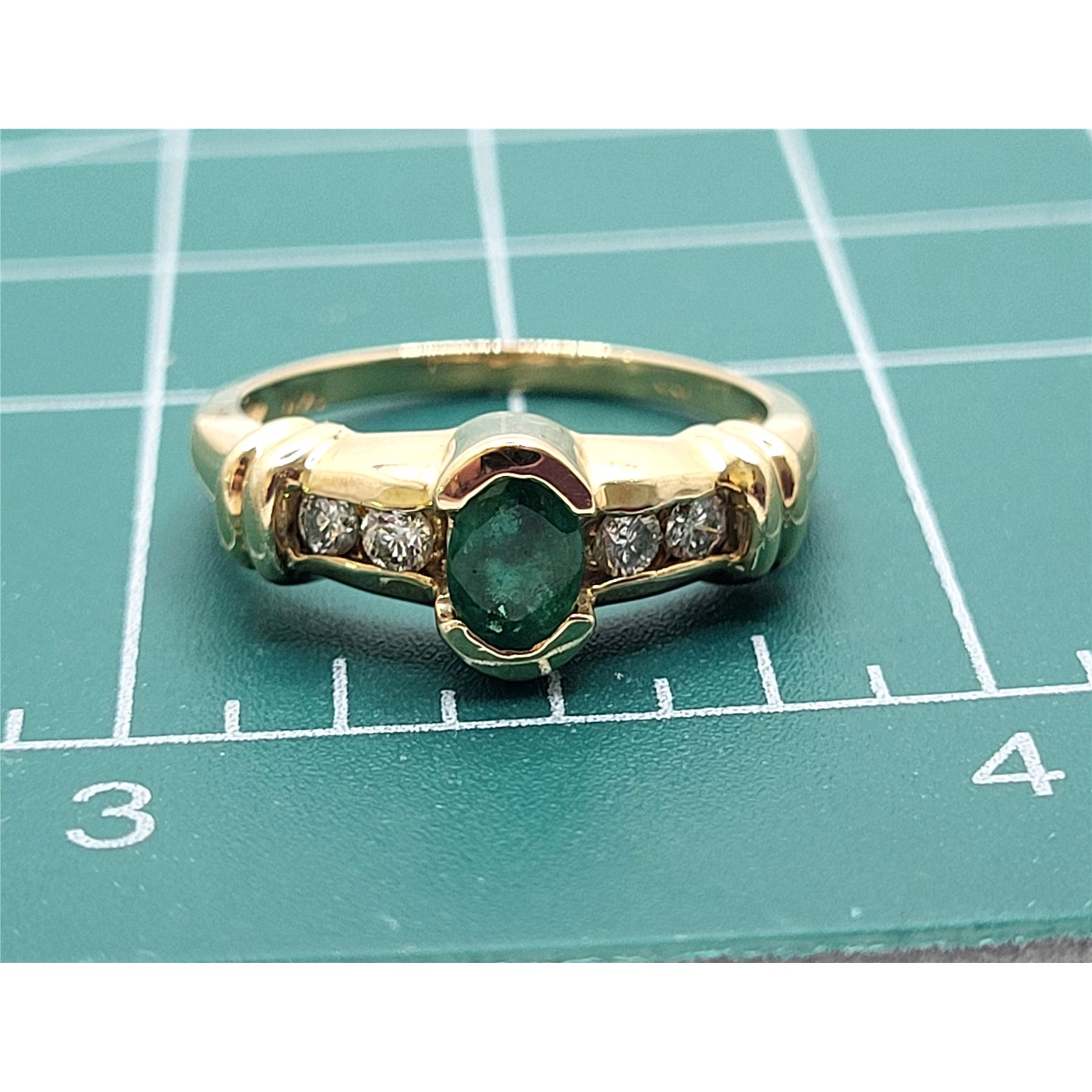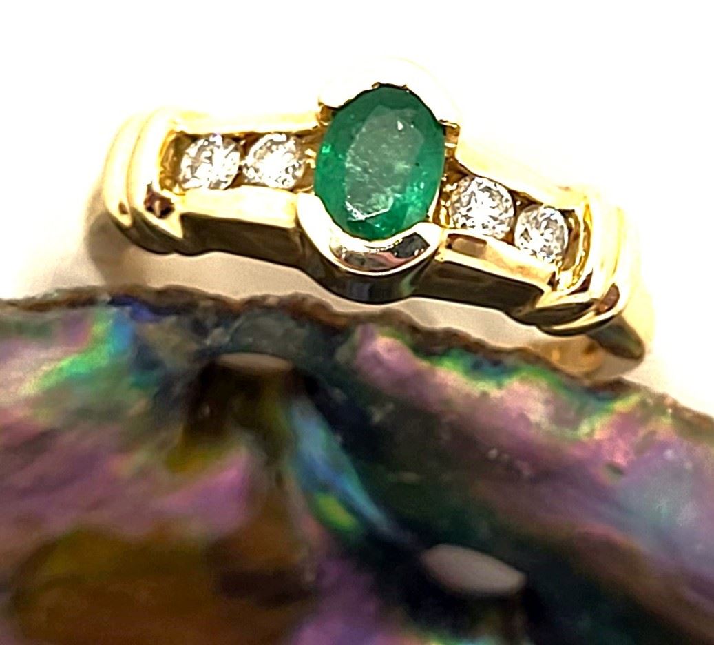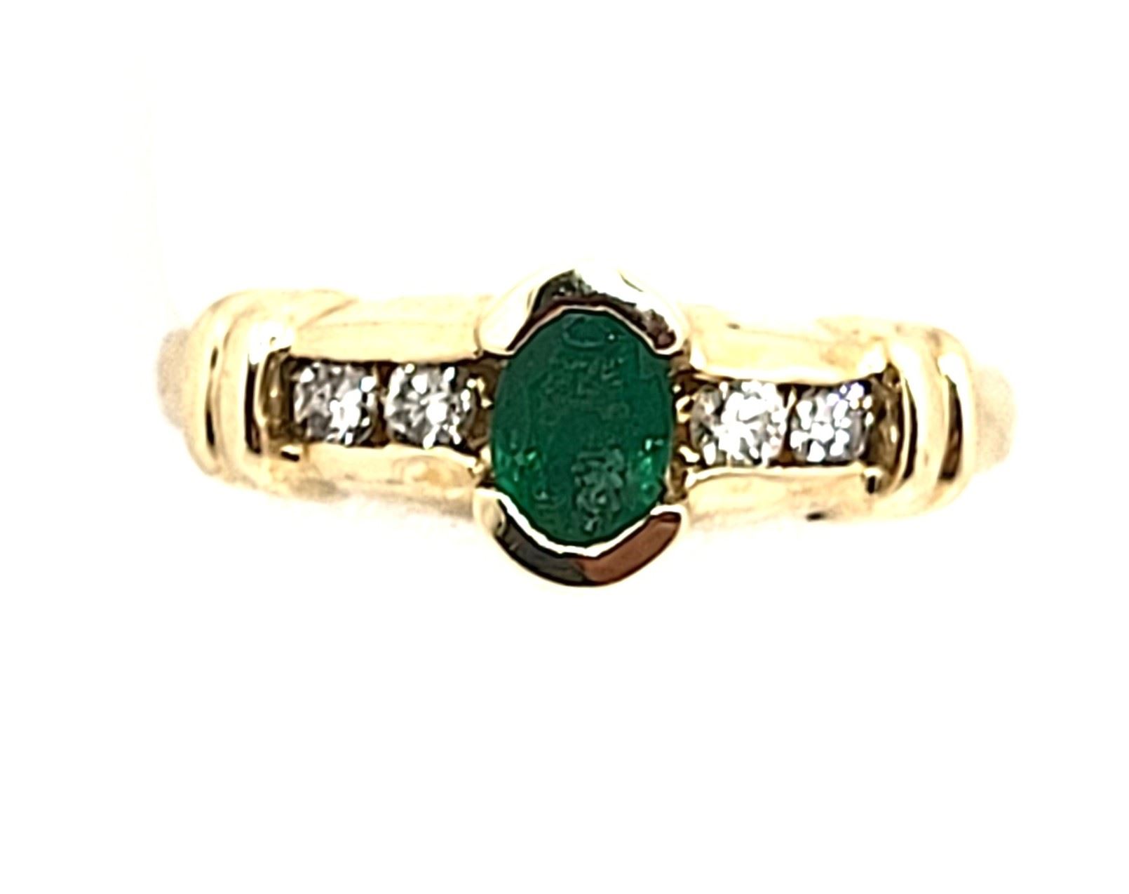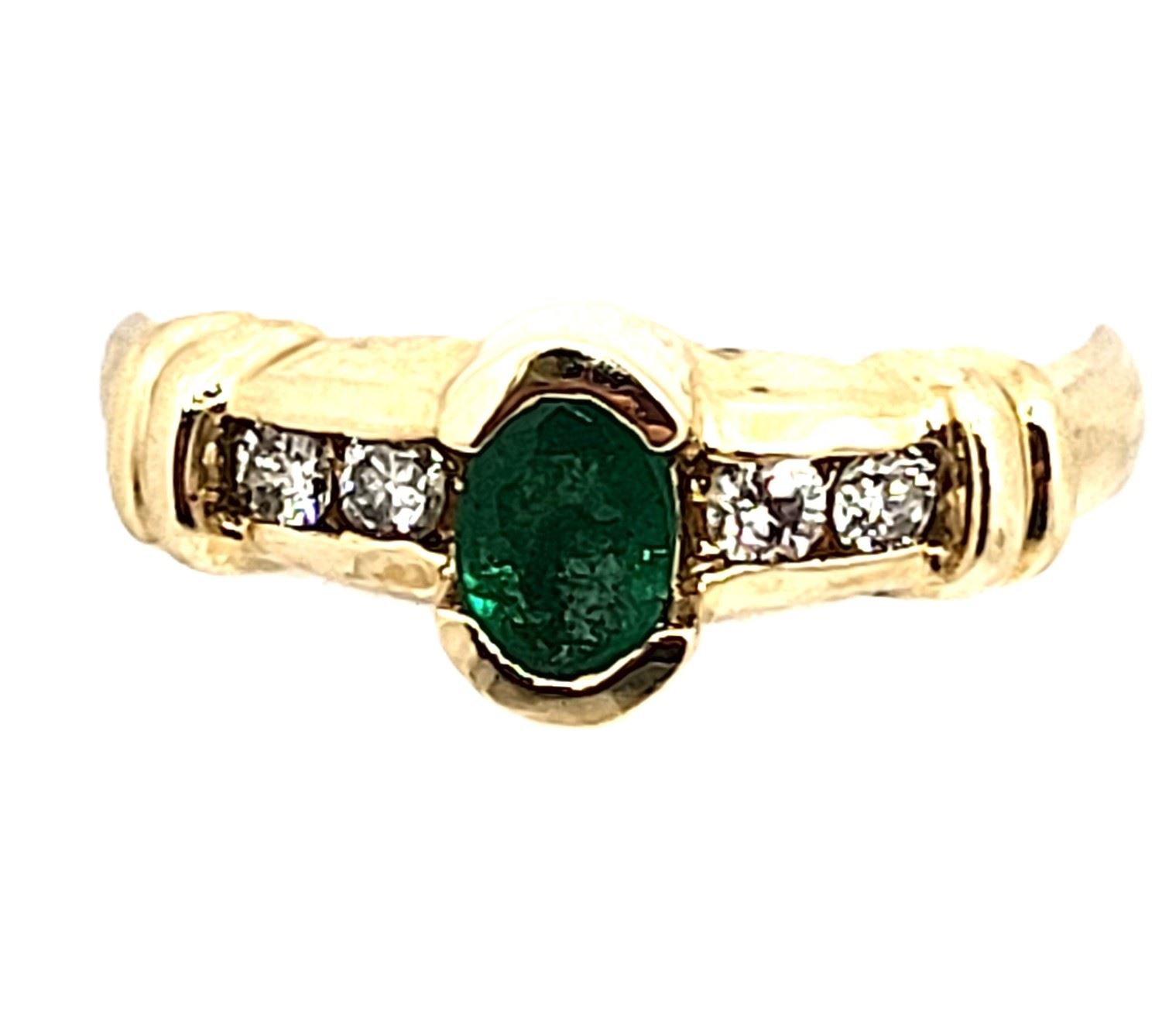 This is a 14 karat yellow gold ring that features a .50 carat, oval-cut, semi-bezel set, genuine emerald and .19 carats of round, brilliant-cut, H, SI2, channel-set diamonds along the shoulders. The protection provided by the bezel and the channels, combined with the trendy ribbed shoulders, makes this ring ideal for everyday wear. This ring is US size 7. See below for details on sizing and other information.& nbsp; Admin: G11241/4ngt