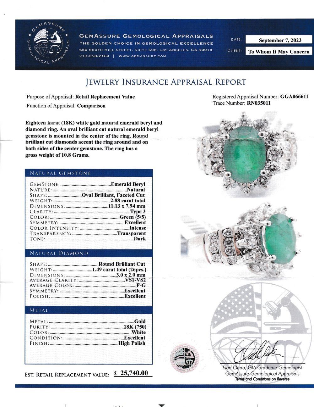 ADDITIONAL INFORMATION: This white gold ring features an amazing, bright green emerald that is prong-set in a classic setting with an astounding halo of exceptional quality diamonds. The wide, diamond shoulders taper to an approximate 3.7mm shank.