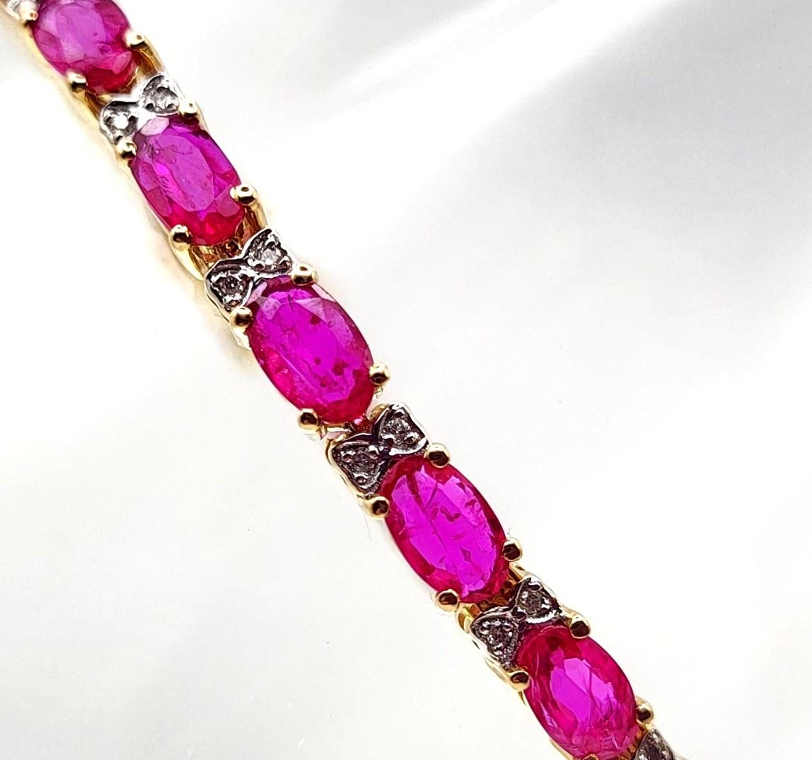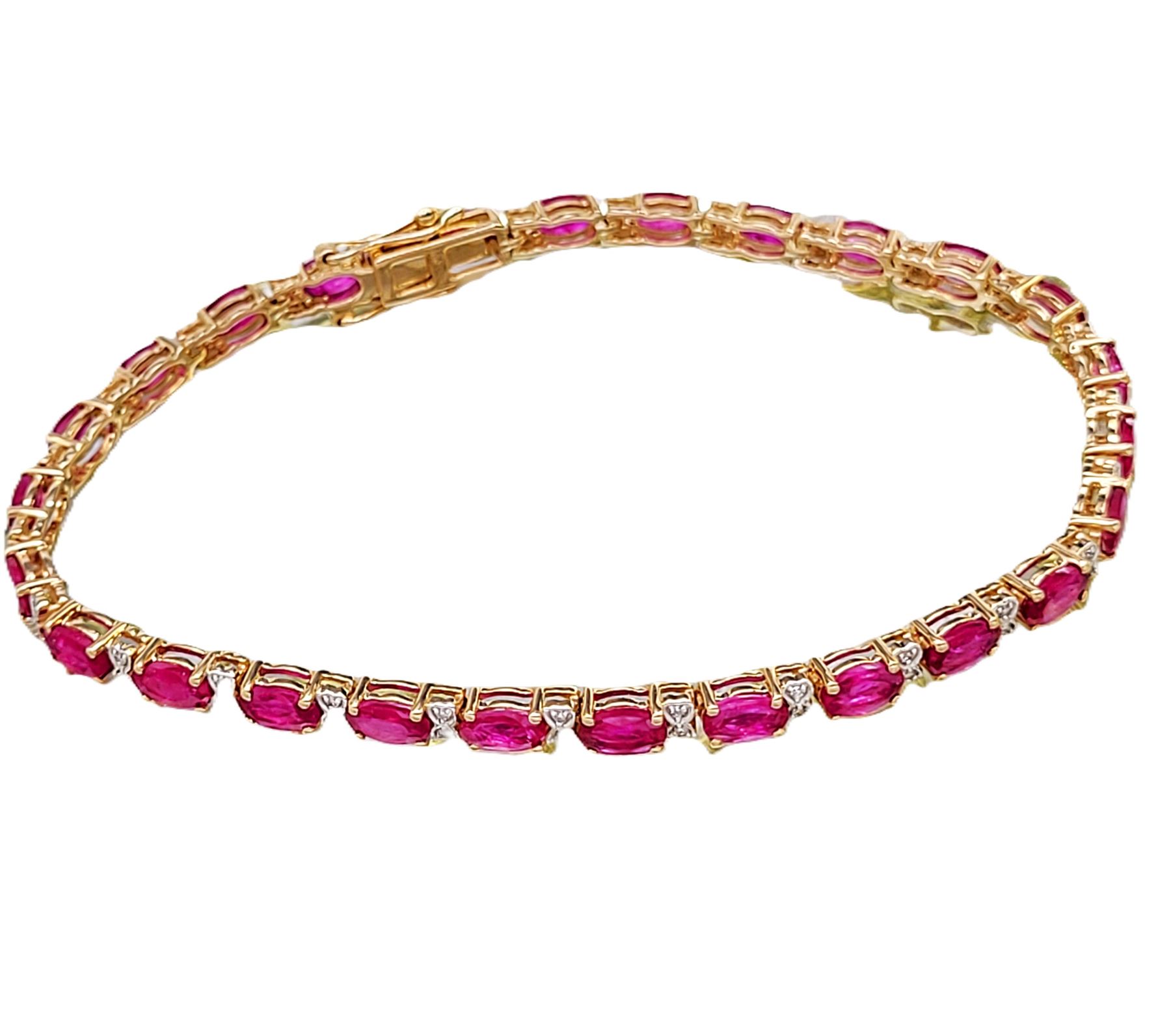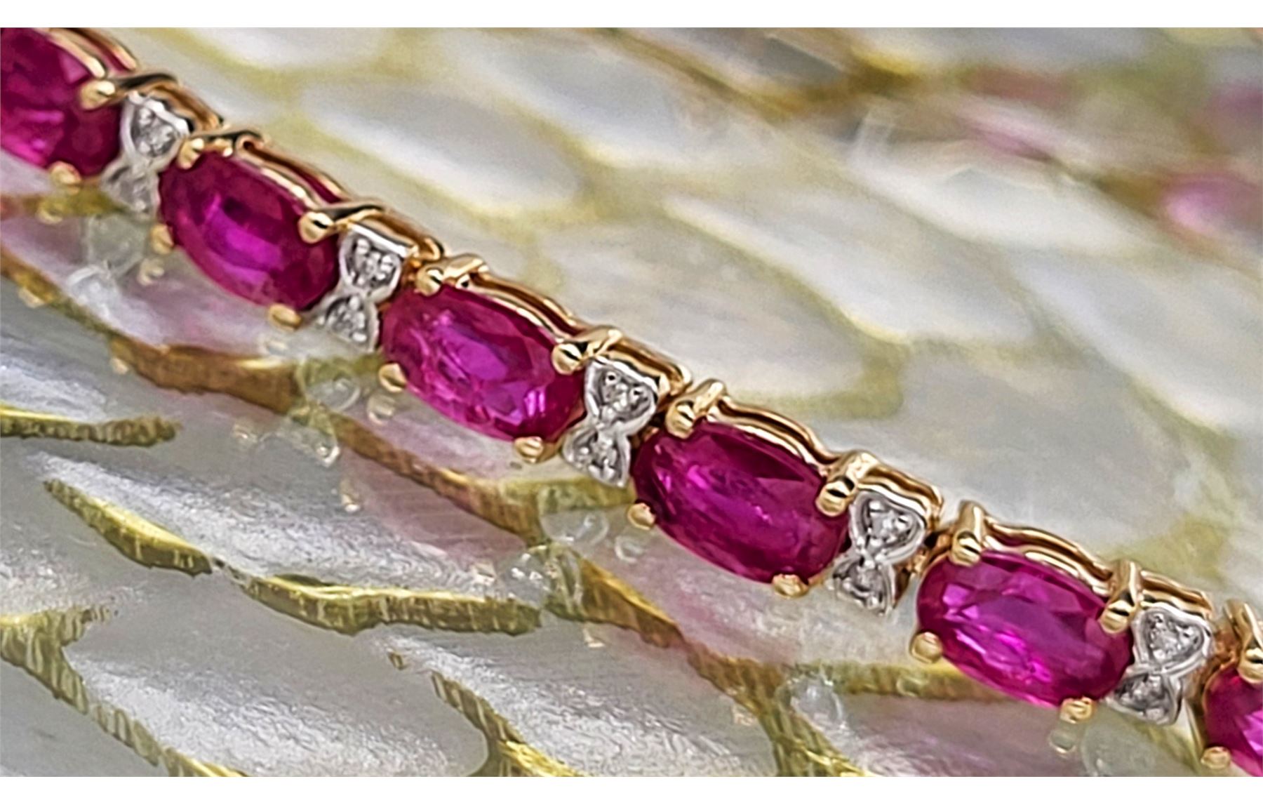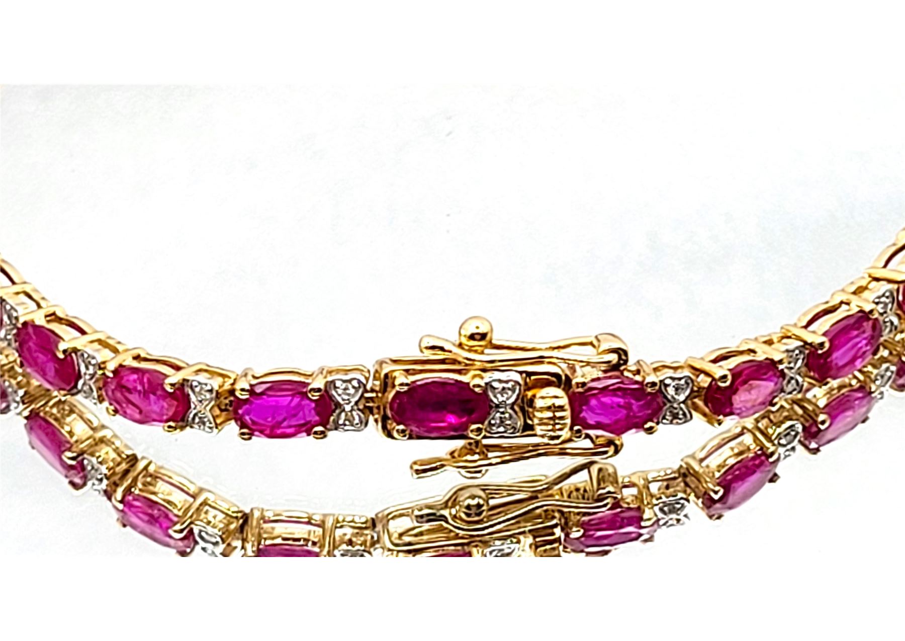 This 14 karat yellow gold bracelet contains over 5.00 carats of genuine, oval-cut rubies and each ruby represents an individual link.& nbsp; The links are separated by diamond-accentuated bow-tie shaped hinge covers. That means this bracelet has 5.87 carats of precious gemstones when you sum up the 5.72 carats total weight of rubies and the .15 carats total weight of round, faceted H-I color, I1 clarity diamonds! The bracelet is 7& quot; long and has a hidden box clasp with 2 figure-eight safety clips.& nbsp; Admin: Q5743/31-bigr