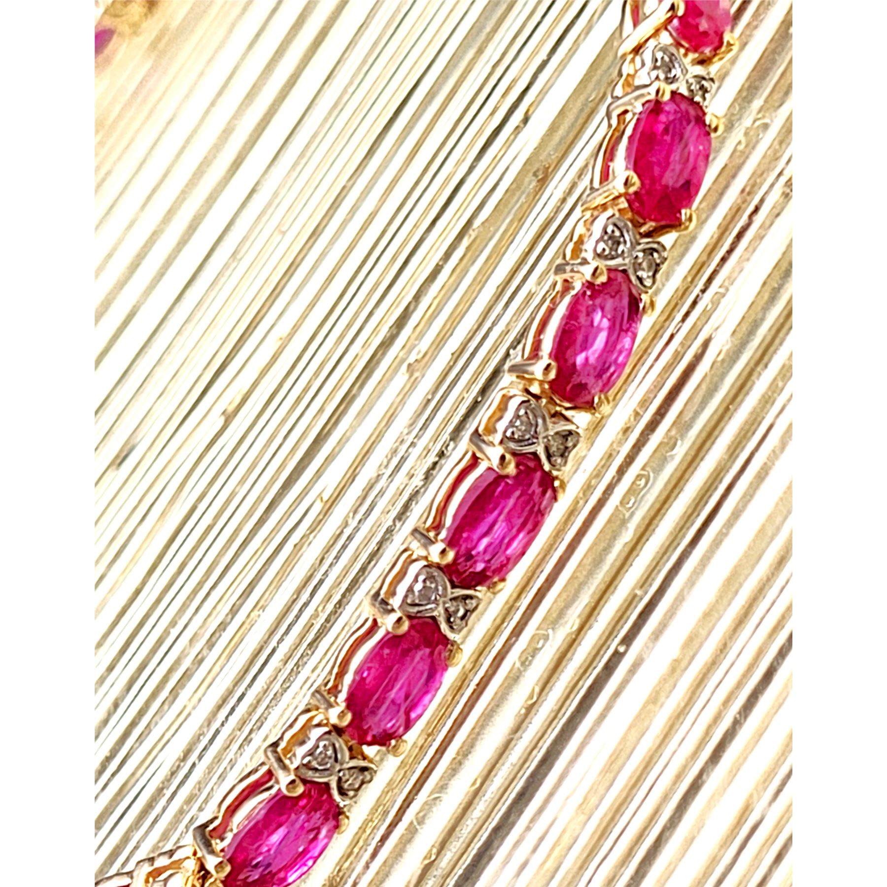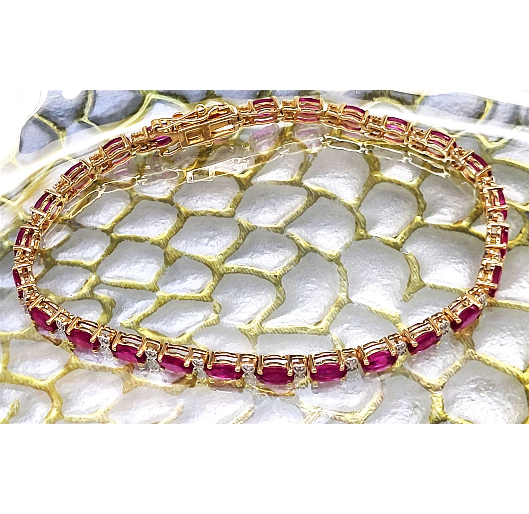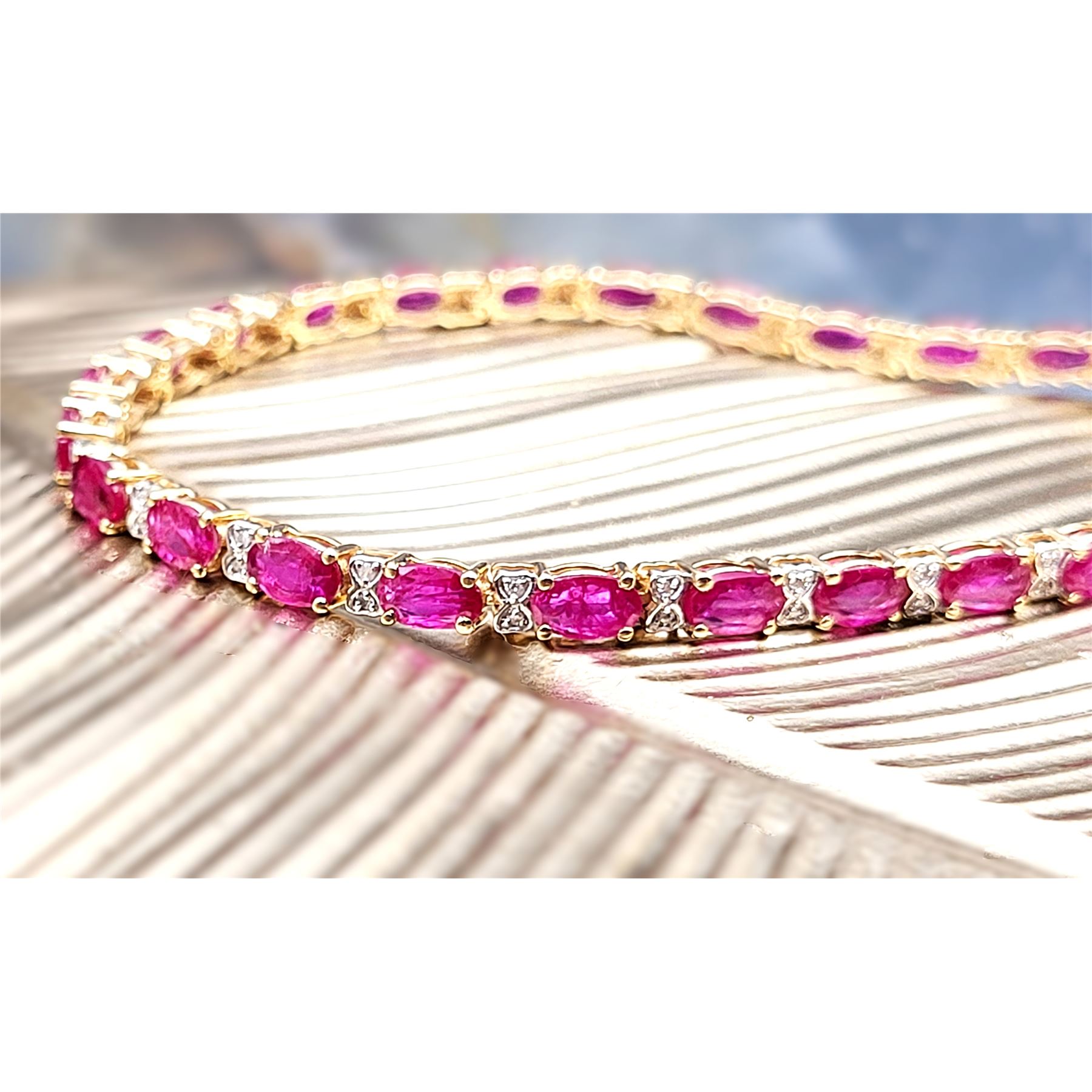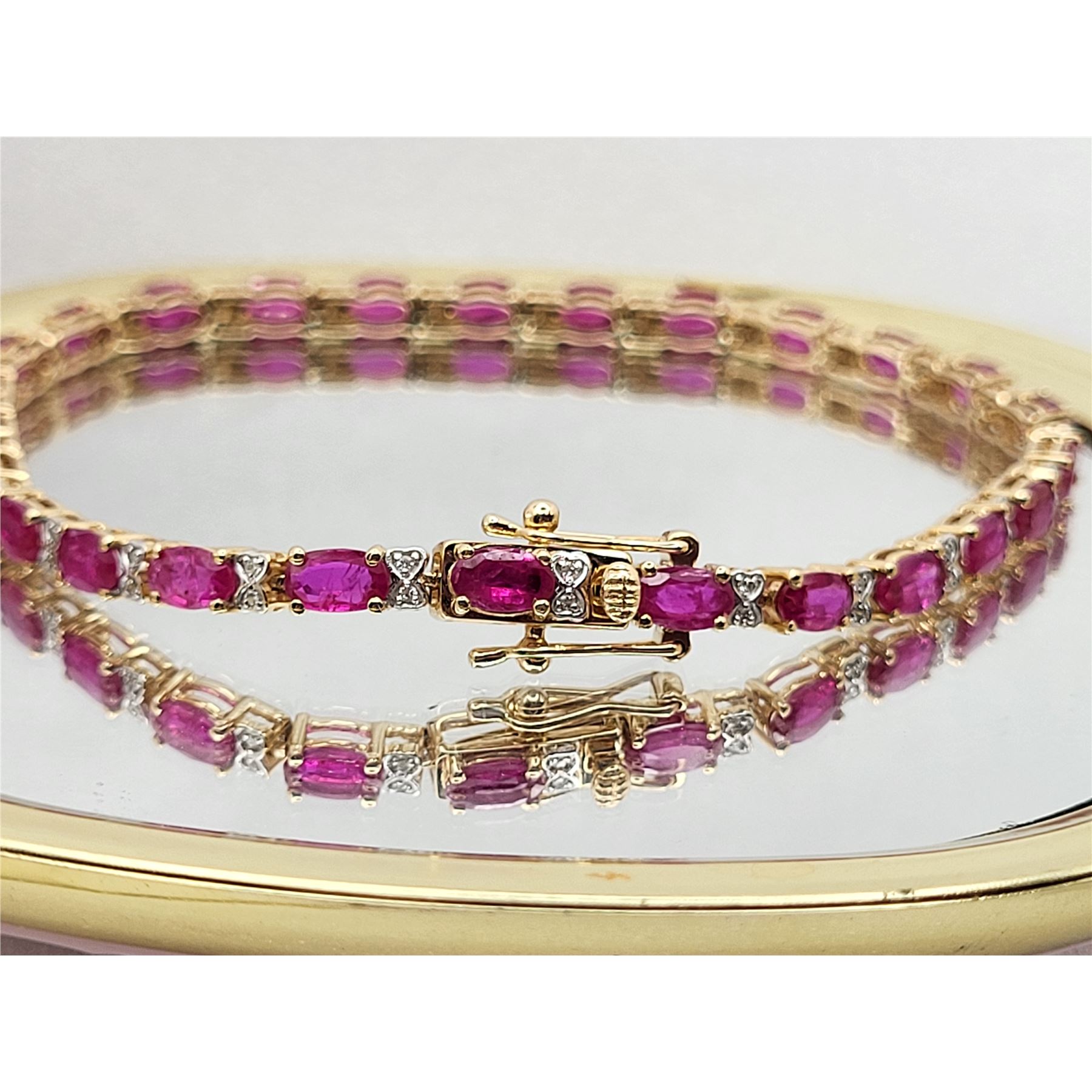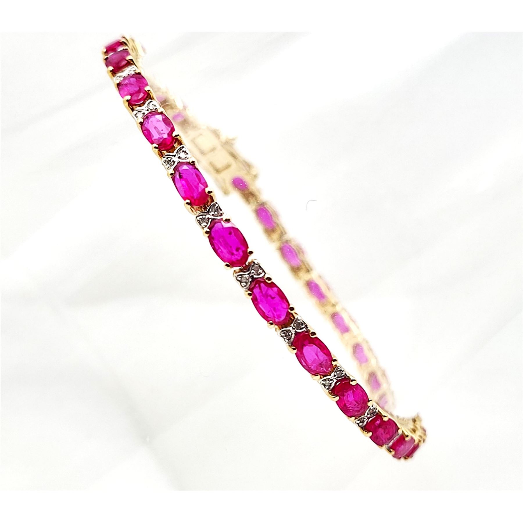 This 14 karat yellow gold bracelet contains over 5.00 carats of genuine, oval-cut rubies and each ruby represents an individual link.& nbsp; The links are separated by diamond-accentuated bow-tie shaped hinge covers. That means this bracelet has 5.87 carats of precious gemstones when you sum up the 5.72 carats total weight of rubies and the .15 carats total weight of round, faceted H-I color, I1 clarity diamonds! The bracelet is 7& quot; long and has a hidden box clasp with 2 figure-eight safety clips.& nbsp; Admin: Q5743/31-bigr