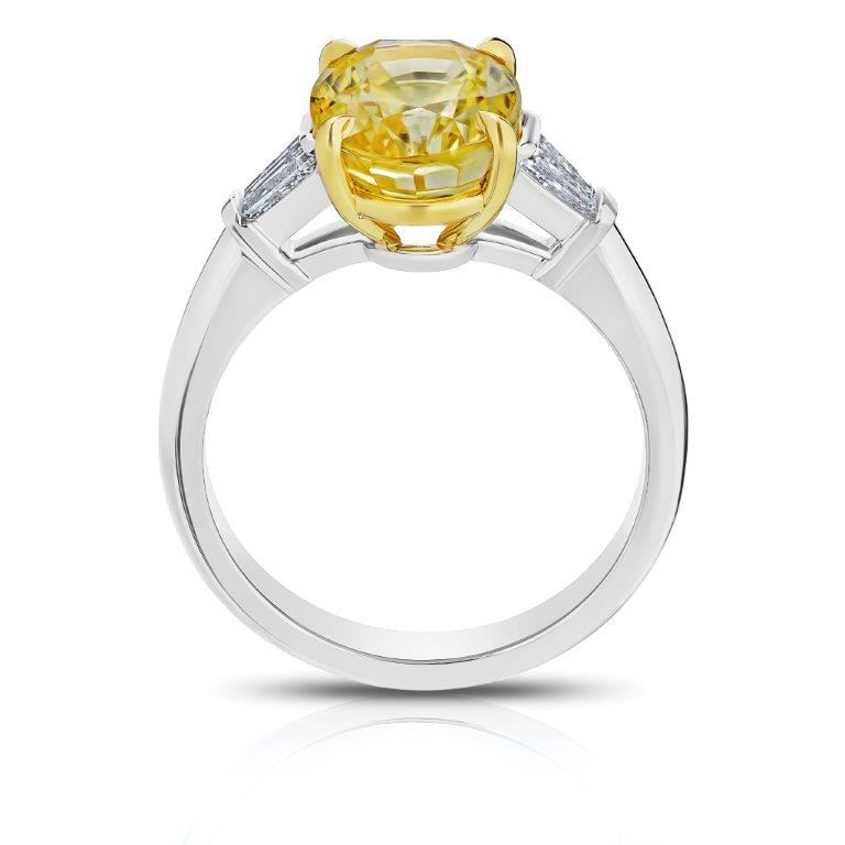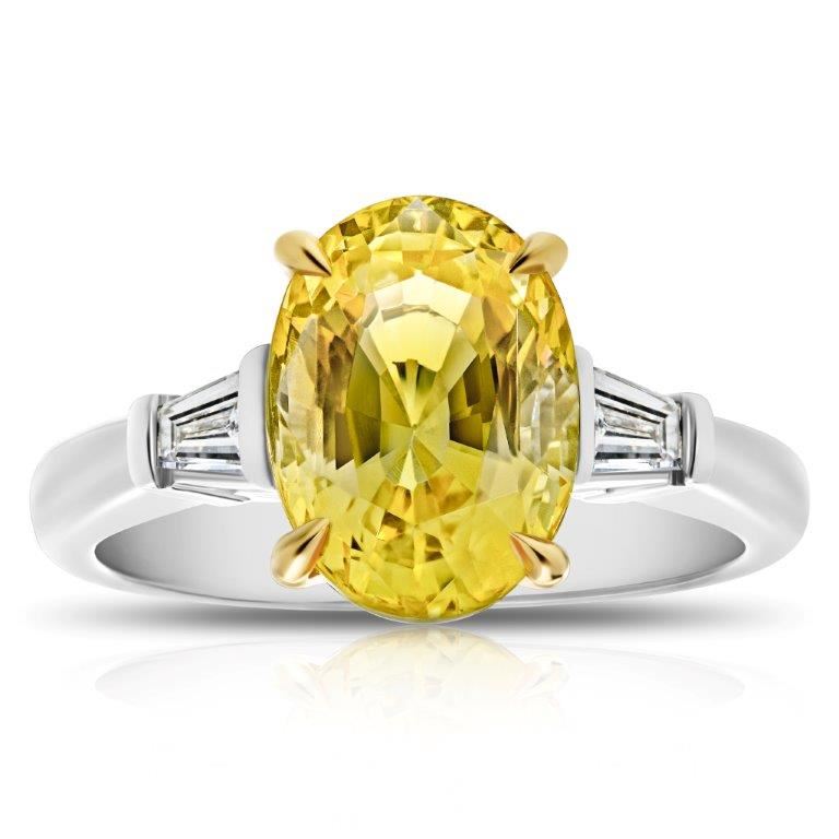 4.97 Carat Yellow Oval Sapphire Ring, with Tapered Baguette Diamonds side stones weighing 0.31 carat set in a custom platinum mounting.
