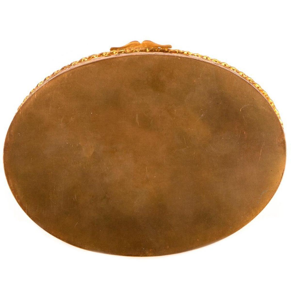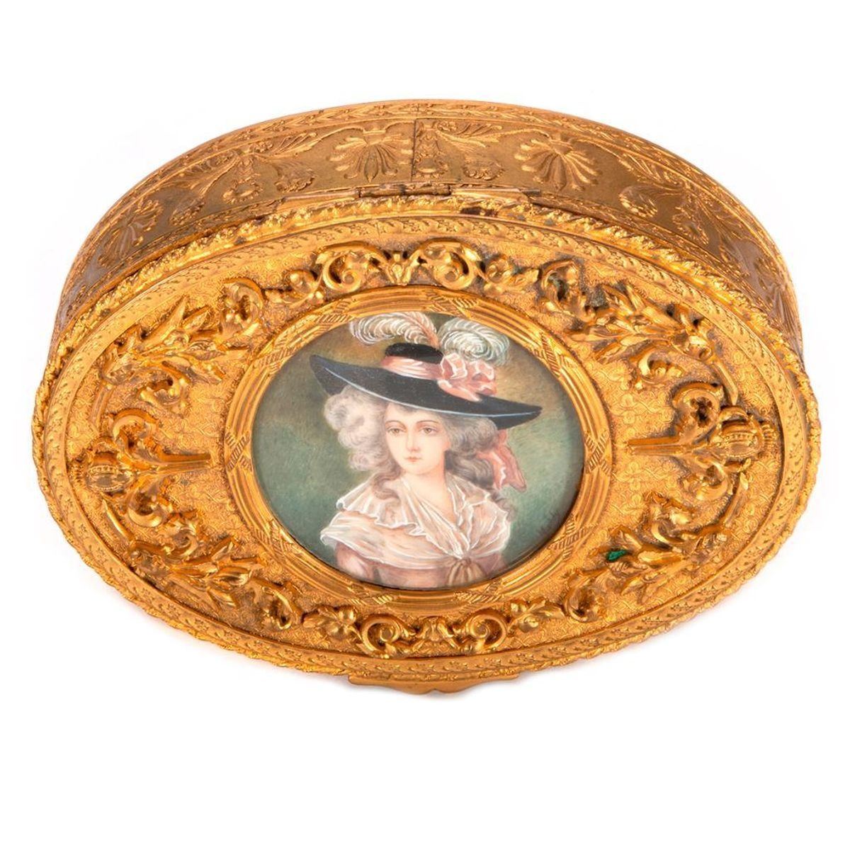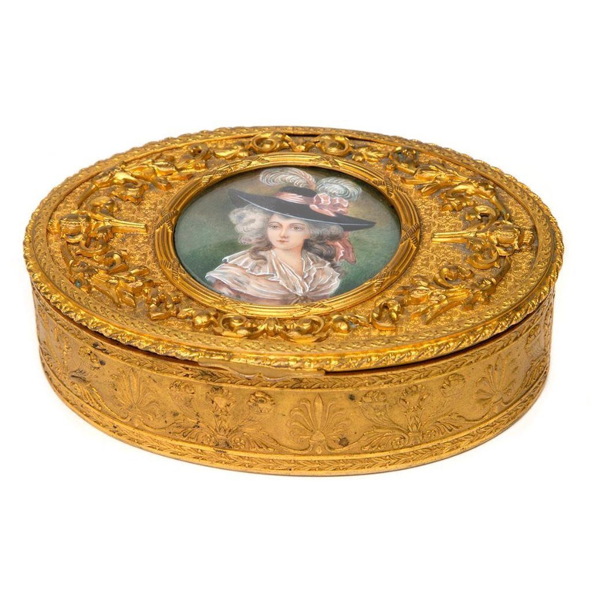 Round Portrait Plaque mounted in the top of a oval gilt brass box, painting signed Naddy, interior lined in fabric. H-1.25" W-5.5" D-4" Condition: Very Good.
