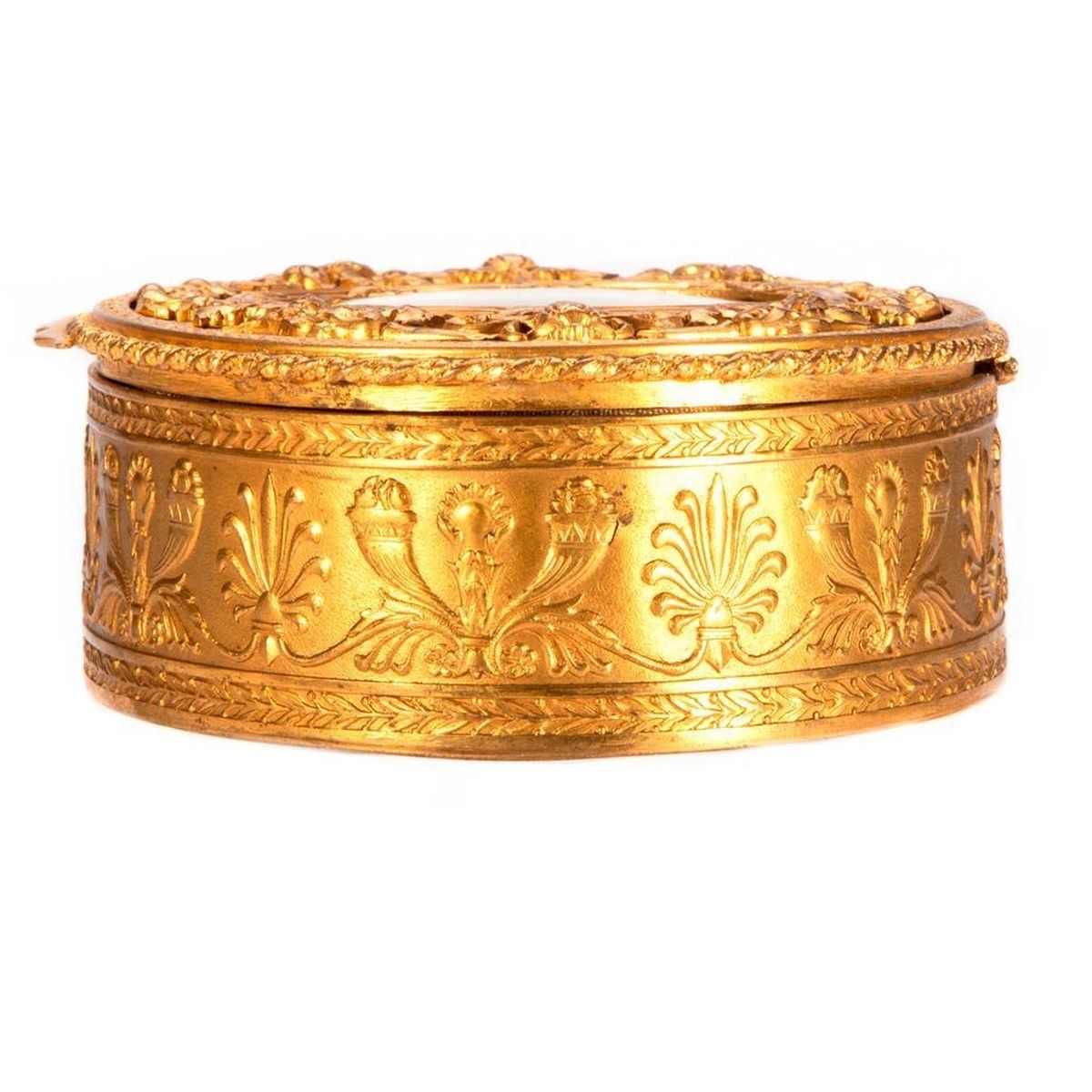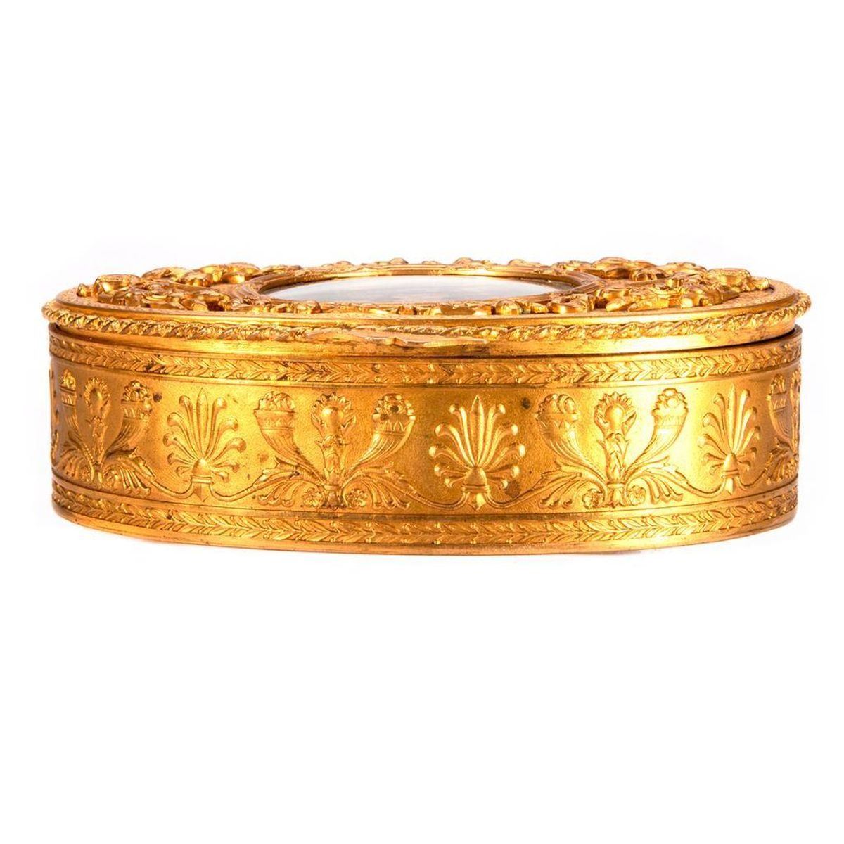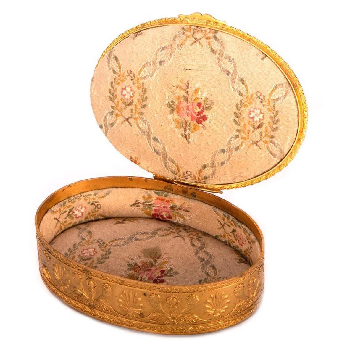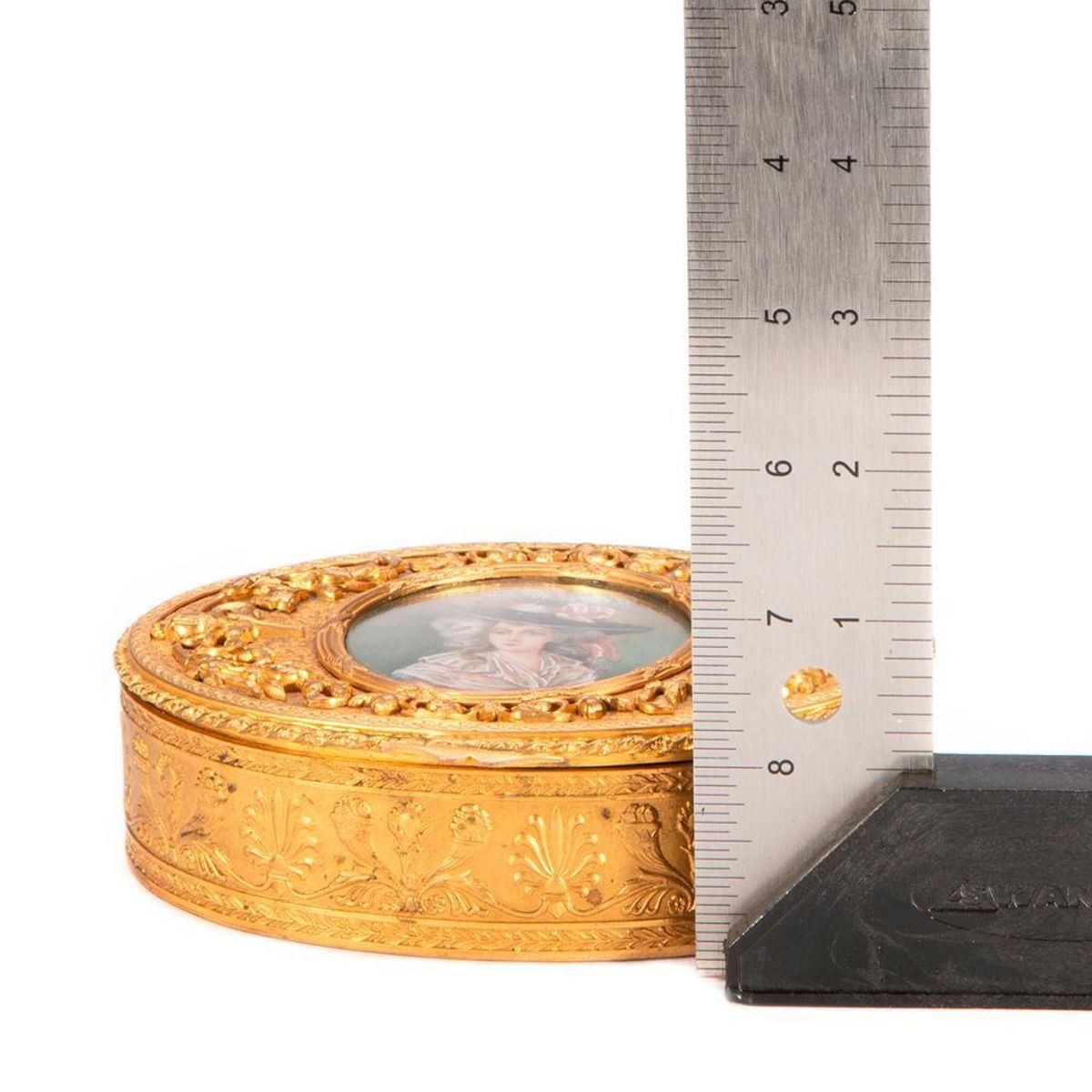 Round Portrait Plaque mounted in the top of a oval gilt brass box, painting signed Naddy, interior lined in fabric. H-1.25" W-5.5" D-4" Condition: Very Good.
