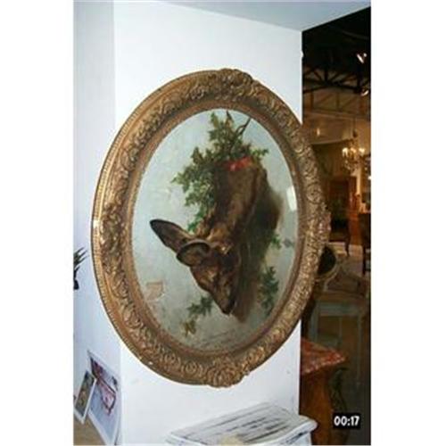 </font></strong>This is an oval hunting painting from France. It is oil on canvas, and it is very old... late 1700's. The frame is original Louis XV. By the writing on the lower portion of the frame, it appears this was a gift from the artist to a good friend. Please contact for more pictures. Thank you--Le Louvre Antiques</font>