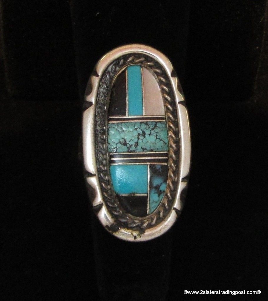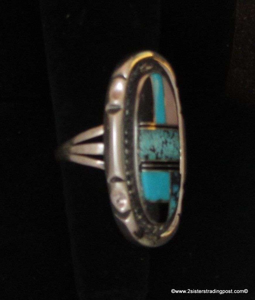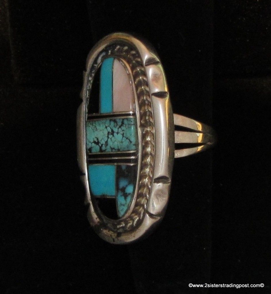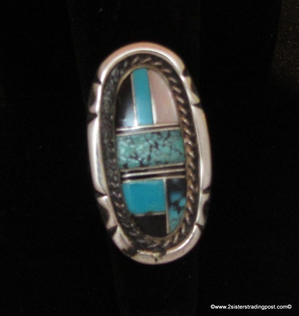 Size 7.25 oval 10 stone and shell ring inlay is designed with 3 types of turquoise that is enhanced by mother-of-pearl and jet. The inlay measures 26.9 mm x 10.8 mm the overall measurement is 35 mm x 19.3 mm and weighs 15.1 g. Ring is stamped sterling but is not signed by the artist.