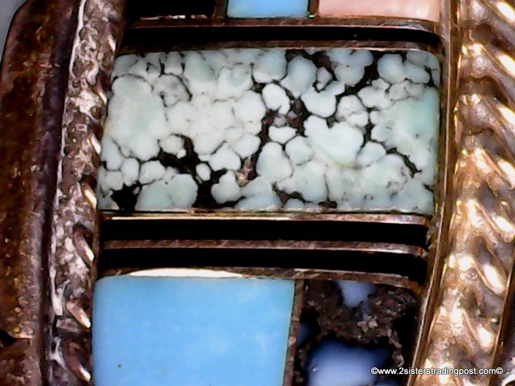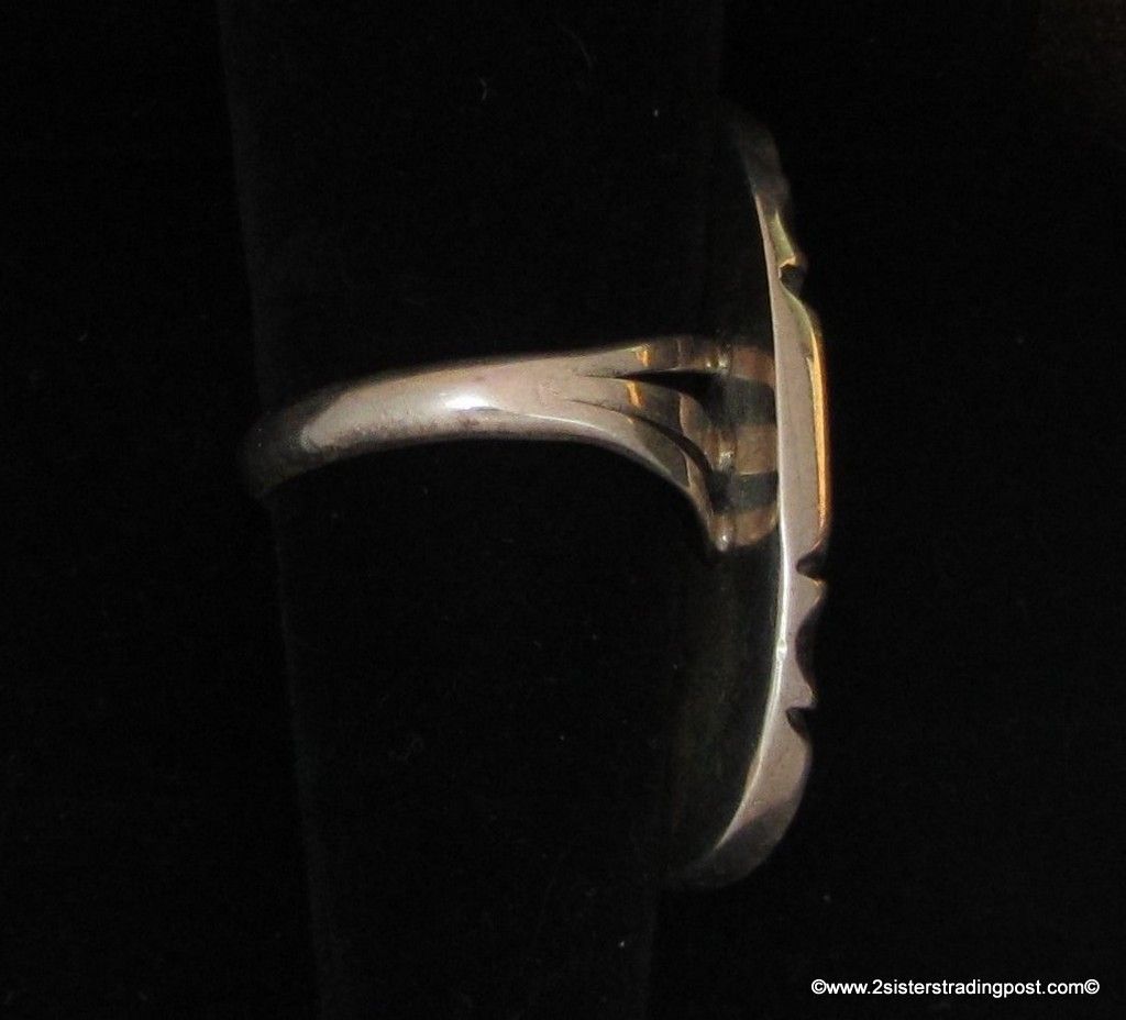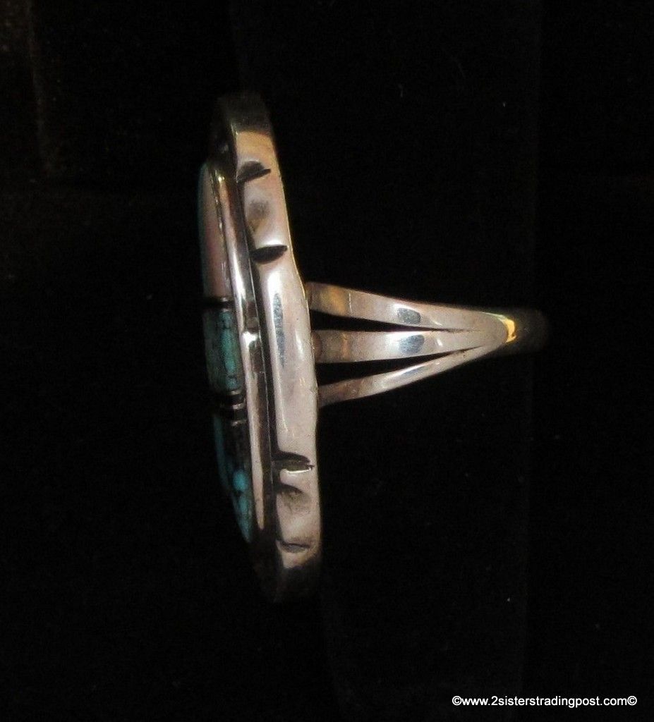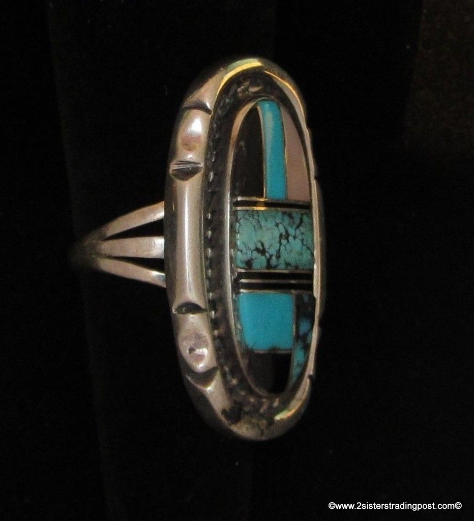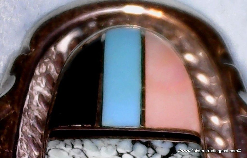 Size 7.25 oval 10 stone and shell ring inlay is designed with 3 types of turquoise that is enhanced by mother-of-pearl and jet. The inlay measures 26.9 mm x 10.8 mm the overall measurement is 35 mm x 19.3 mm and weighs 15.1 g. Ring is stamped sterling but is not signed by the artist.