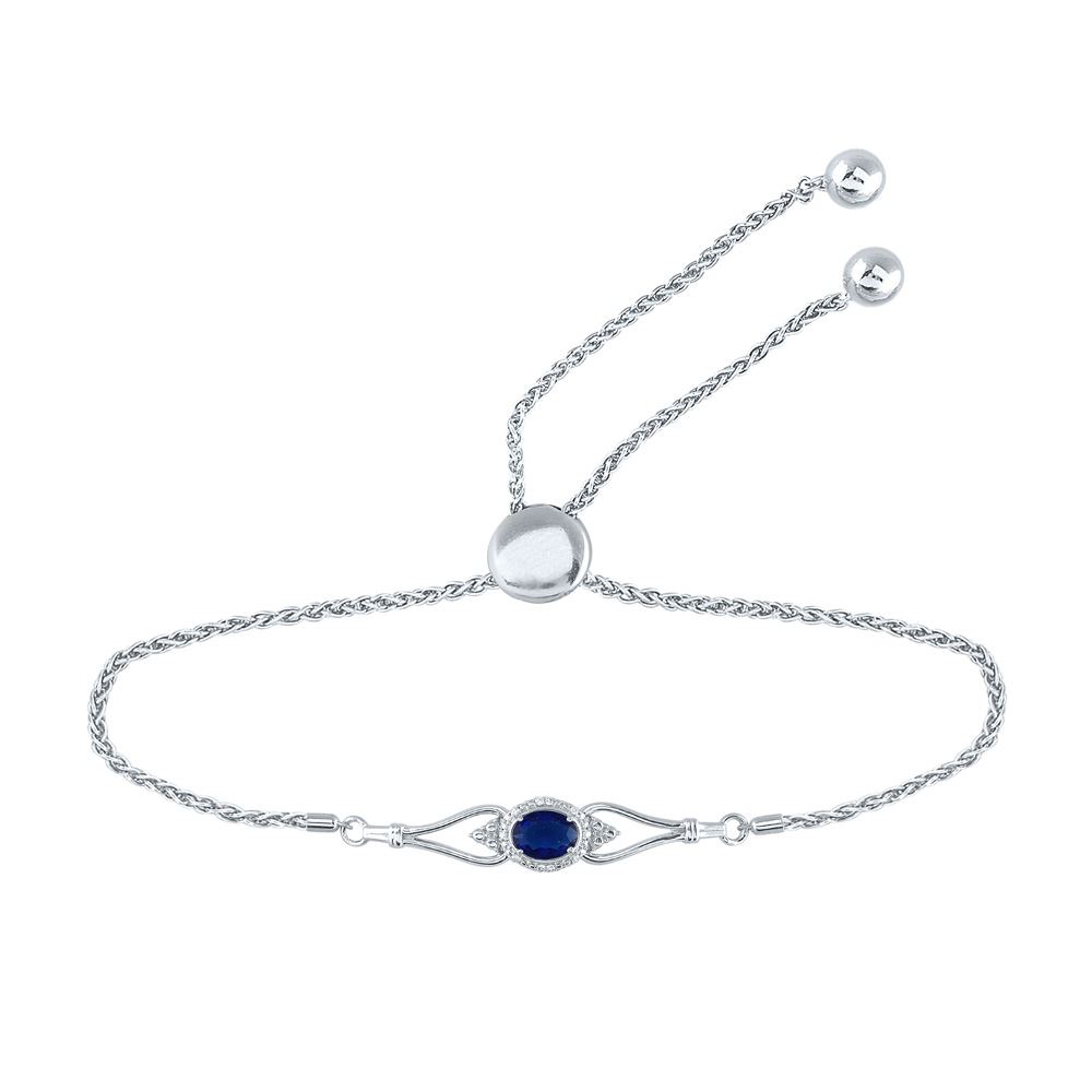 Sterling Silver Womens Oval Lab-Created Blue Sapphire Diamond Bolo Bracelet 1 Cttw